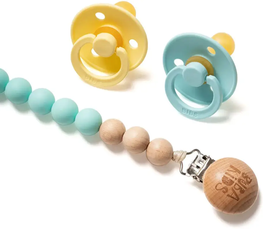 Держатель подходит как для классических пустышек Bibs Colour, так и для Bibs Supreme, специальное переходное колечко уже в комплекте. При изготовлении используются только качественные силиконовые бусины из 100% пищевого силикона, также натуральные деревянные бусины из бука. Крепление выполнено также из бука. Держатель безопасен по составу, без вкуса и запаха. Его можно мыть в мыльной воде.