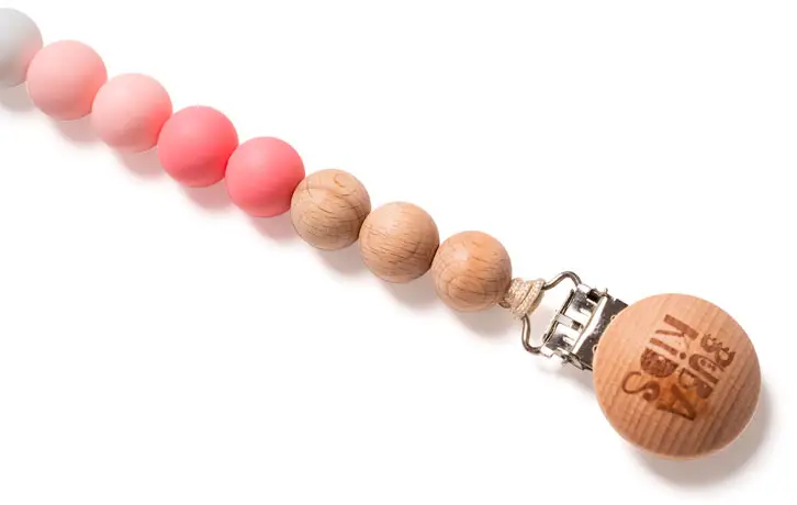 Держатель для пустышки из силиконовых и деревянных буковых бусин отлично подходит для детей от 6 месяцев.