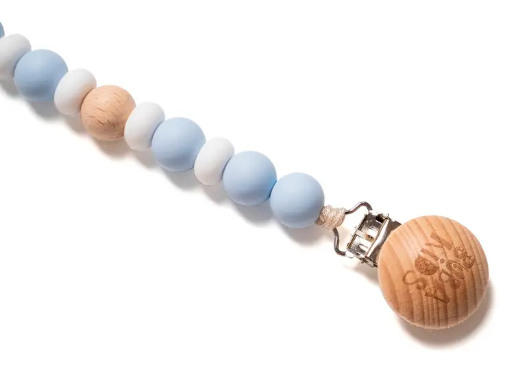 Держатель для пустышки из силиконовых и деревянных буковых бусин отлично подходит для детей от 6 месяцев.