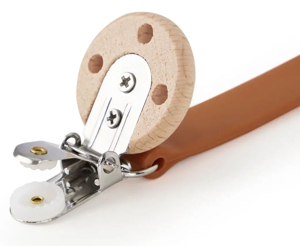 Стильный держатель на страже гигиены и здоровья малыша. Теперь вы можете быть уверены, что пустышка или прорезыватель не потеряются и останутся чистыми. Ремешок из мягкого силикона безопасно и приятно грызть. Металлическая клипса с деревянной защитной насадкой надёжно крепится и красиво выглядит. Незаменимая вещь для ежедневных прогулок и длительных поездок.