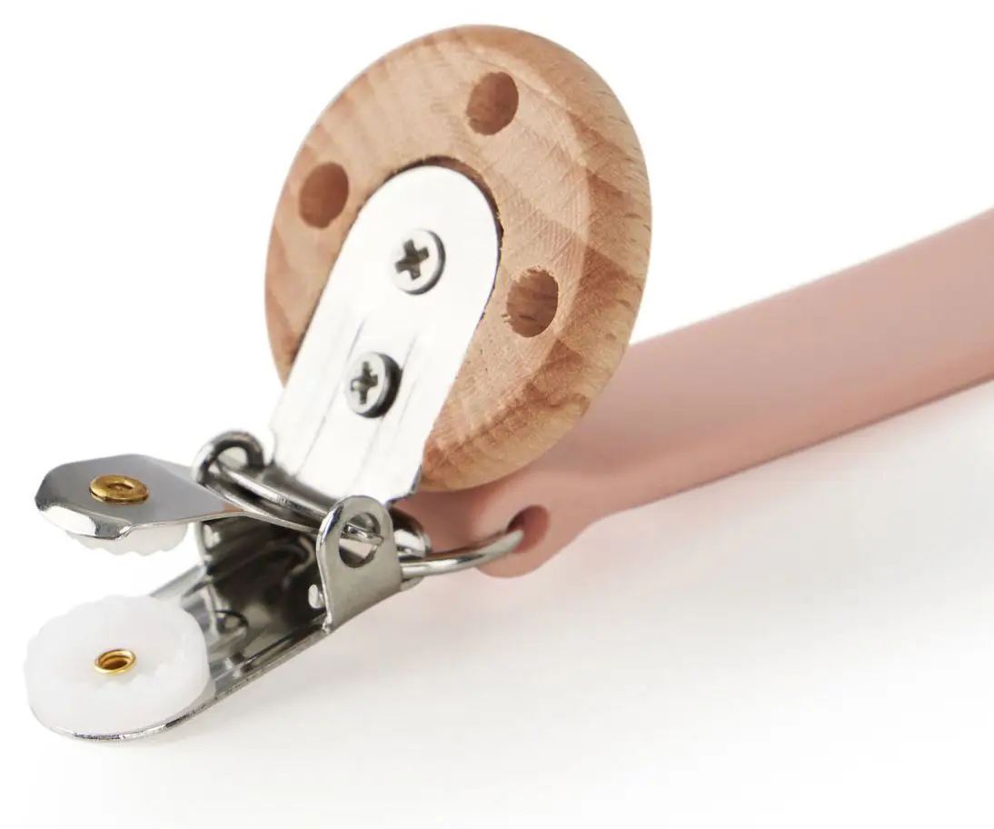 Стильный держатель на страже гигиены и здоровья малыша. Теперь вы можете быть уверены, что пустышка или прорезыватель не потеряются и останутся чистыми. Ремешок из мягкого силикона безопасно и приятно грызть. Металлическая клипса с деревянной защитной насадкой надёжно крепится и красиво выглядит. Незаменимая вещь для ежедневных прогулок и длительных поездок.