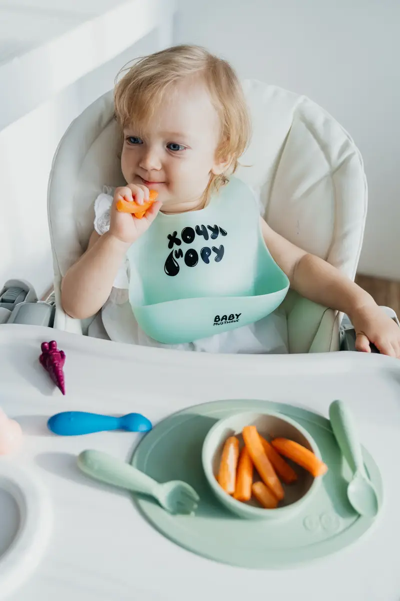 Силиконовый нагрудник Baby Musthave защитит одежду малыша от попадания еды и станет идеальным помощником для мамы.