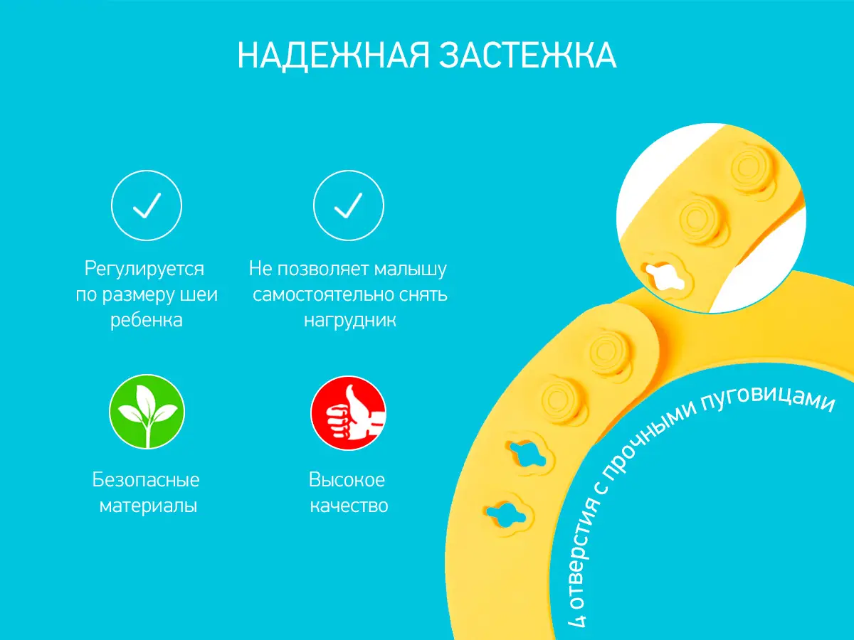 - застежка надежная, ребенок не сможет самостоятельно снять слюнявчик. Регулировать и корректировать степень прилегания к шее можно по мере взросления малыша;