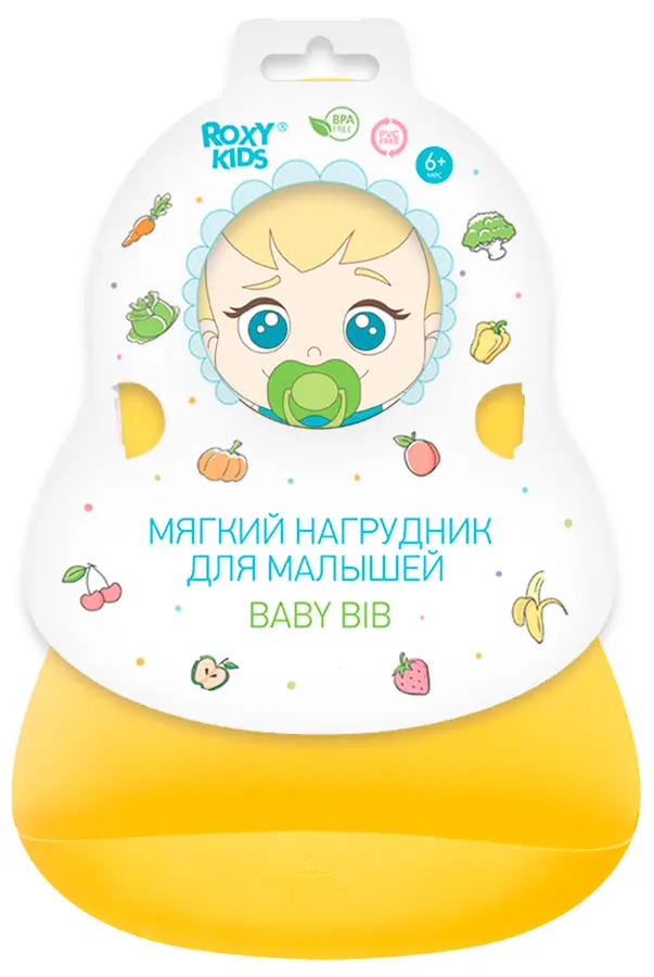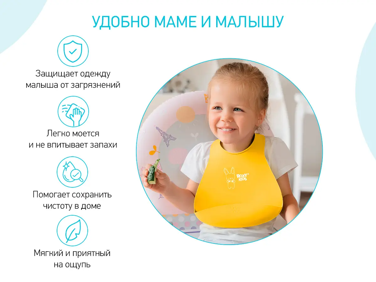 Мягкий нагрудник от Roxy Kids не доставит неудобств малышу и сэкономит время мамы на уборке и стирке.