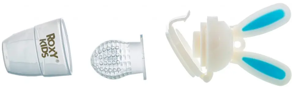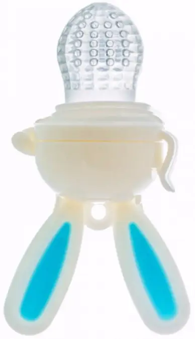 В специальную насадку-сеточку складывается еда, тяжелая для жевания, и малыш может по принципу соски самостоятельно попробовать разжевать ее без вреда для маленьких зубиков и еще не окрепших десен.