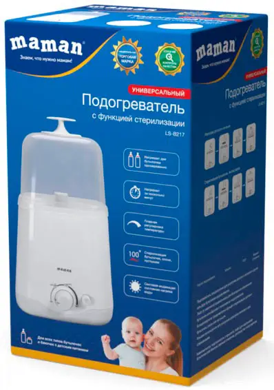Подходит для всех типов бутылочек. Плавная регулировка температуры. Автоматически поддерживает заданную температуру нагрева. Индикатор состояния нагрева и готовности. Стерилизация бутылочек, сосок, пустышек.