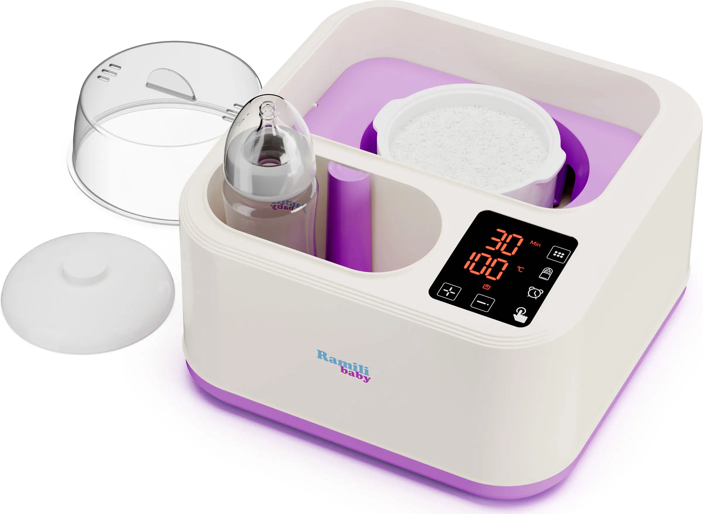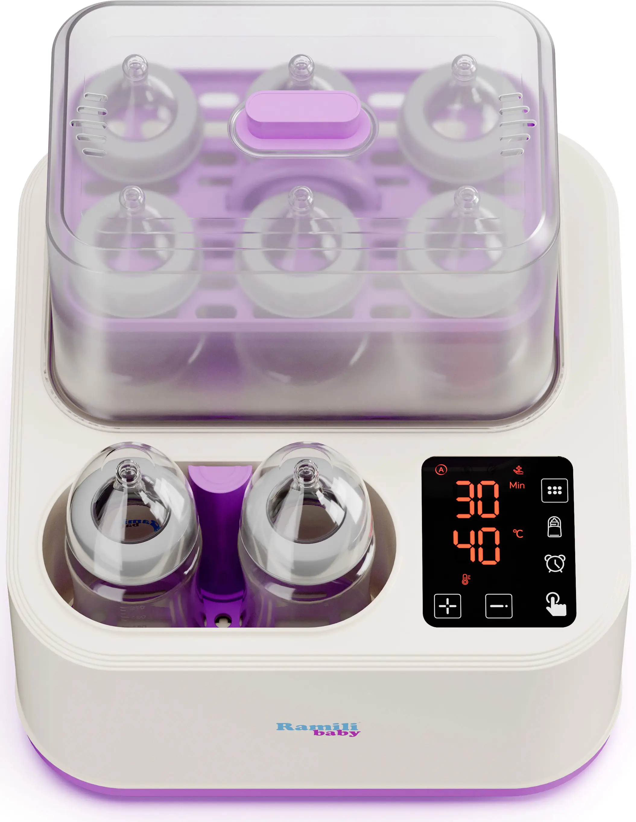 Высокоэффективная паровая стерилизация. Предусмотрена функция сушки и автоматического поддержания бутылочек и аксессуаров стерильными в течение 24 часов. С помощью данного устройства вы сможете сохранить чистоту и здоровье вашего малыша, предотвращая развитие различных инфекций и заболеваний. Особенностью стерилизатора Ramili Baby является функция подогрева, которая позволяет поддерживать оптимальную температуру питания или воды для приготовления смеси. Мама может подогреть детское питание не только в бутылочке, но и в любом подходящем для этого контейнере или в специальном керамическом горшочке, который входит в комплект.