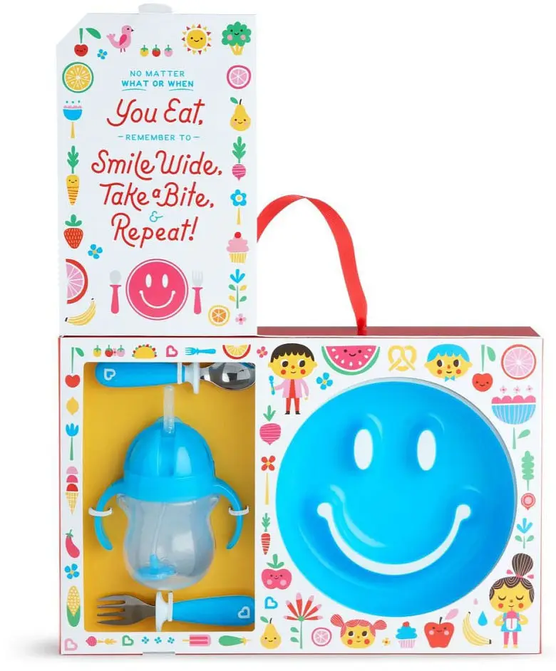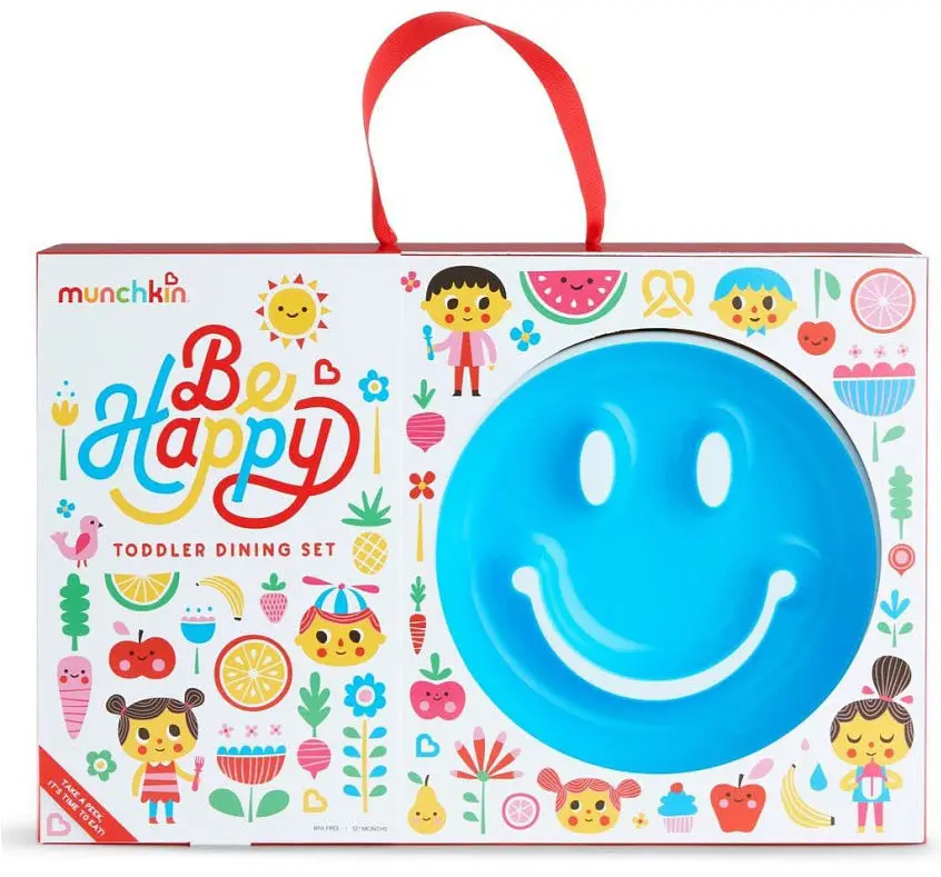 Подарочный набор обеденной детской посуды Be Happy от Munchkin – это яркий и аппетитный способ сделать ребёнка независимым за столом во время приема пищи.