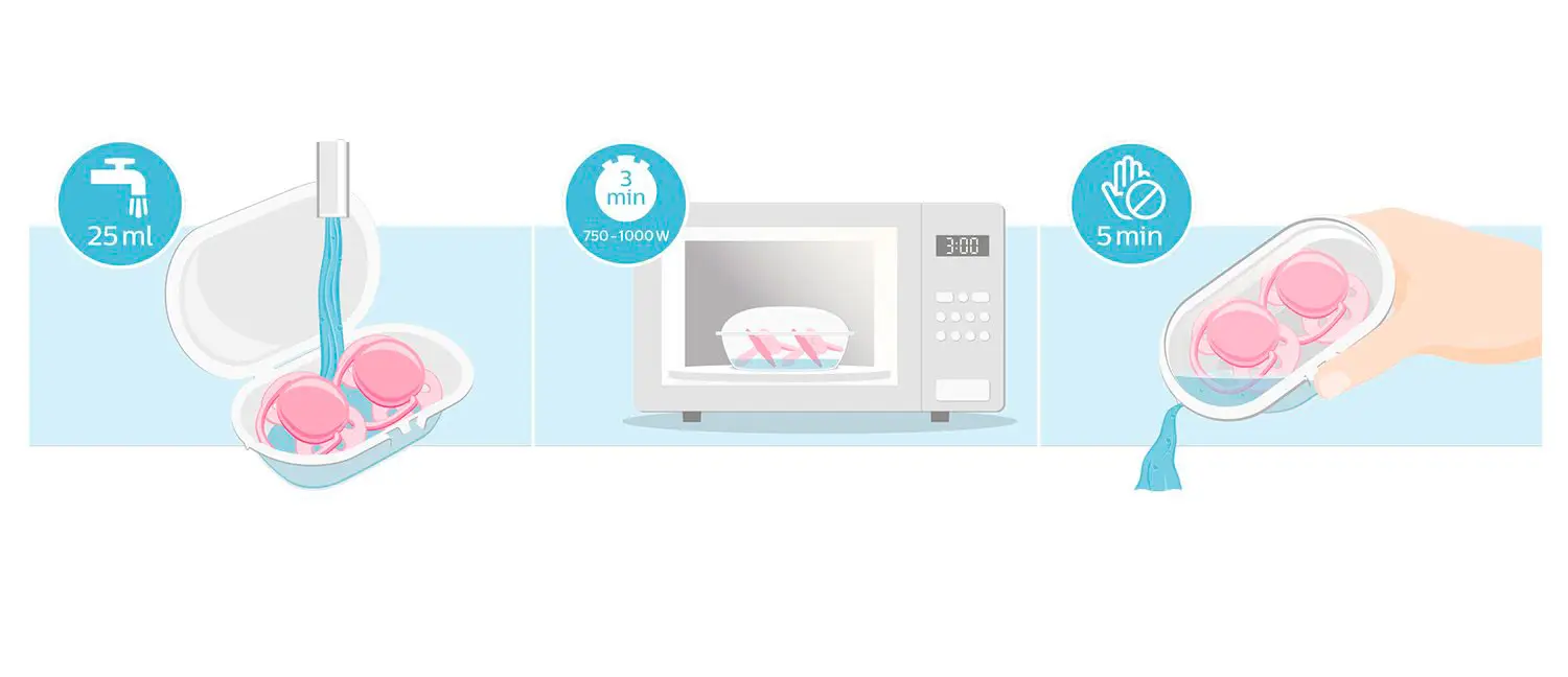 - ультрамягкий дорожный чехол выполняет функцию стерилизатора – вам просто нужно добавить воды и положить его в микроволновую печь. Пустышка вновь будет чистой перед следующим использованием.