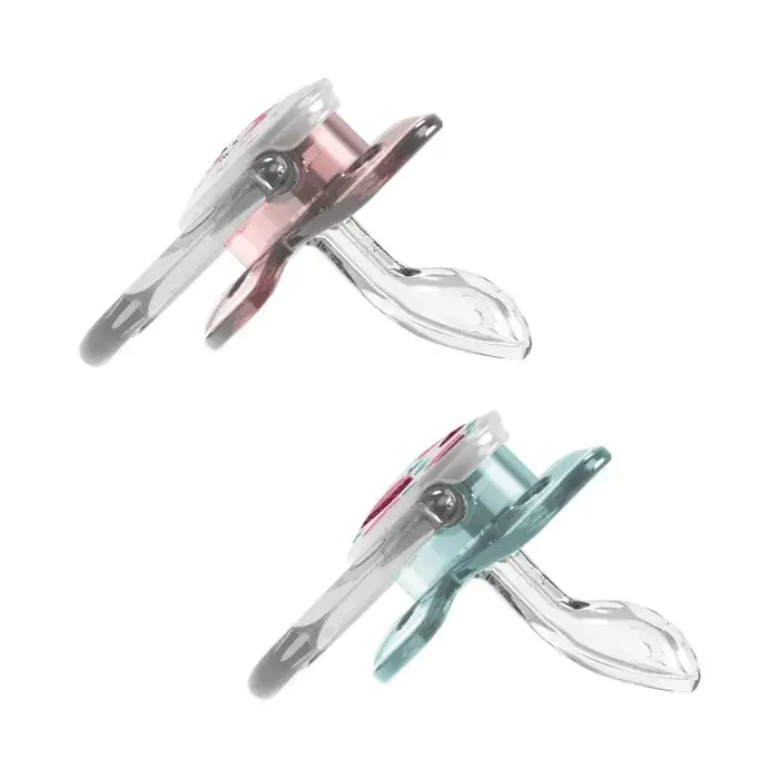 Соски пустышек изготовлены из силикона: идеального материала без вкуса и запаха, который не вступает в реакцию со слюной и не вызывает аллергии.