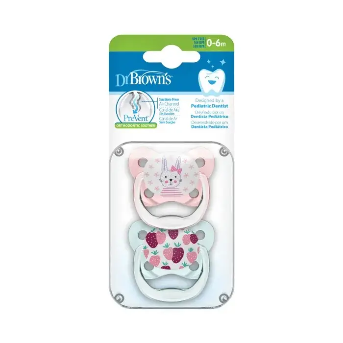 Воздушный канал ослабляет разрежение в ротовой полости и снижает давление на верхнее нёбо. Мягкая, ослабляющая разрежение грушевидная часть соски при сосании расходится в стороны. Основание ортодонтической пустышки PreVent в два раза тоньше, чем у других пустышек, что уменьшает негативное влияние на зубы и ротовую полость ребенка. В отличие от обычных пустышек, уникальная пустышка Dr. Brown’s не ведёт к нарушению прикуса у детей. Загубник пустышки изгибается в сторону от лица ребёнка, чтобы снизить риск появления раздражения на лице малыша.
