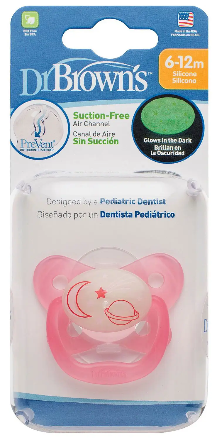 Пустышка силиконовая ортодонтическая Dr. Brown's Prevent Contoured Glow in the Dark (6-12 мес) розовый