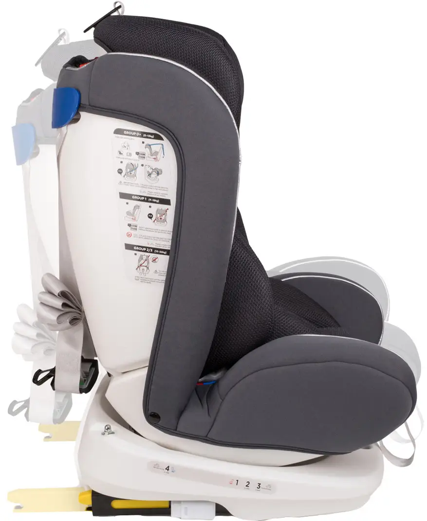спинка регулируется по наклону в 4 положениях – для группы 0+ положение 4 (137°), для I группы положения 1 (103°), 2 (109,5°) и 3 (116°), для II и III групп только положение 2 (109,5°).
