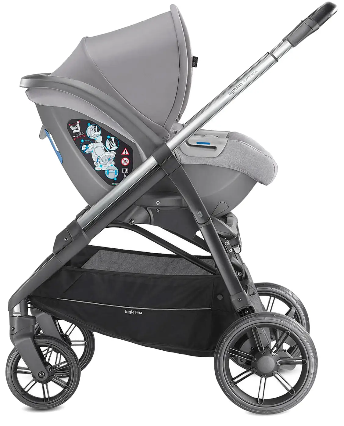 лёгкая установка на подставку Standup или шасси коляски Inglesina (приобретаются отдельно). При установке на подставку Standup можно с лёгкостью использовать как переноску или детский стульчик.