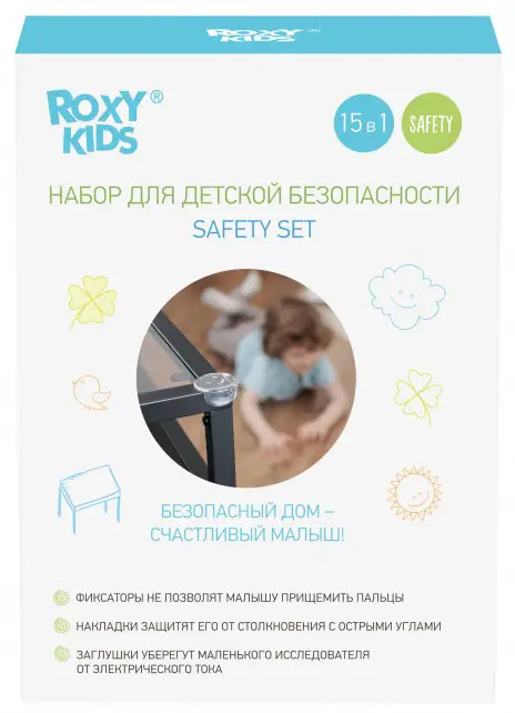 Набор Roxy Kids Безопасность поможет сделать ваше жилище безопасным для крохи – защитить розетки заглушками, закрыть острые углы мебели накладками, закрепить всё ящики блокираторами, а дверь оставить открытой при помощи фиксатора.