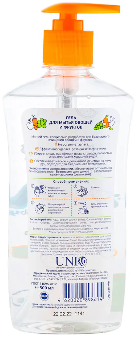 Гель для мытья овощей и фруктов AQA baby 500 мл