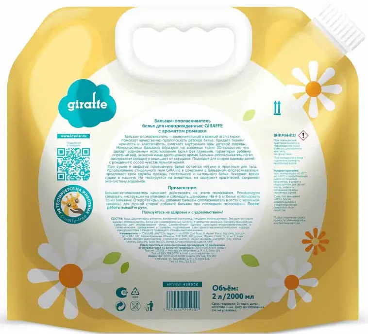 Бальзам ополаскиватель для белья Giraffe Lovular с ароматом ромашки, 2 л, арт. 429900