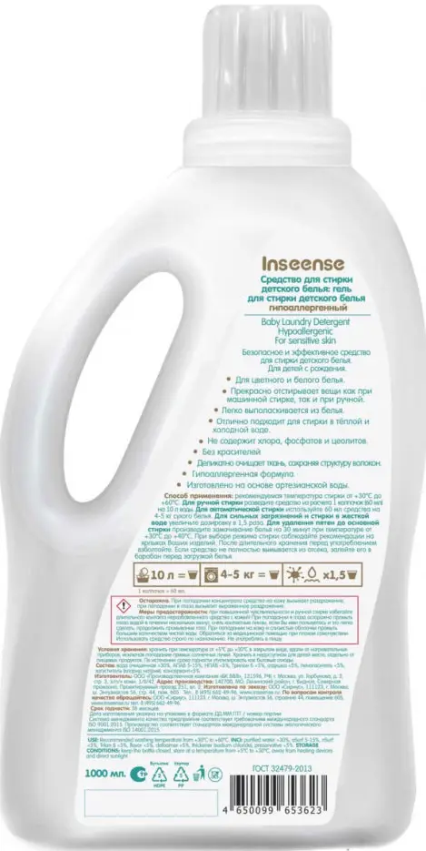 Гель для стирки от Inseense не содержит SLS, SLES, парабенов и красителей. Полностью выстирывается водой. Подходит для применения с первых дней жизни.