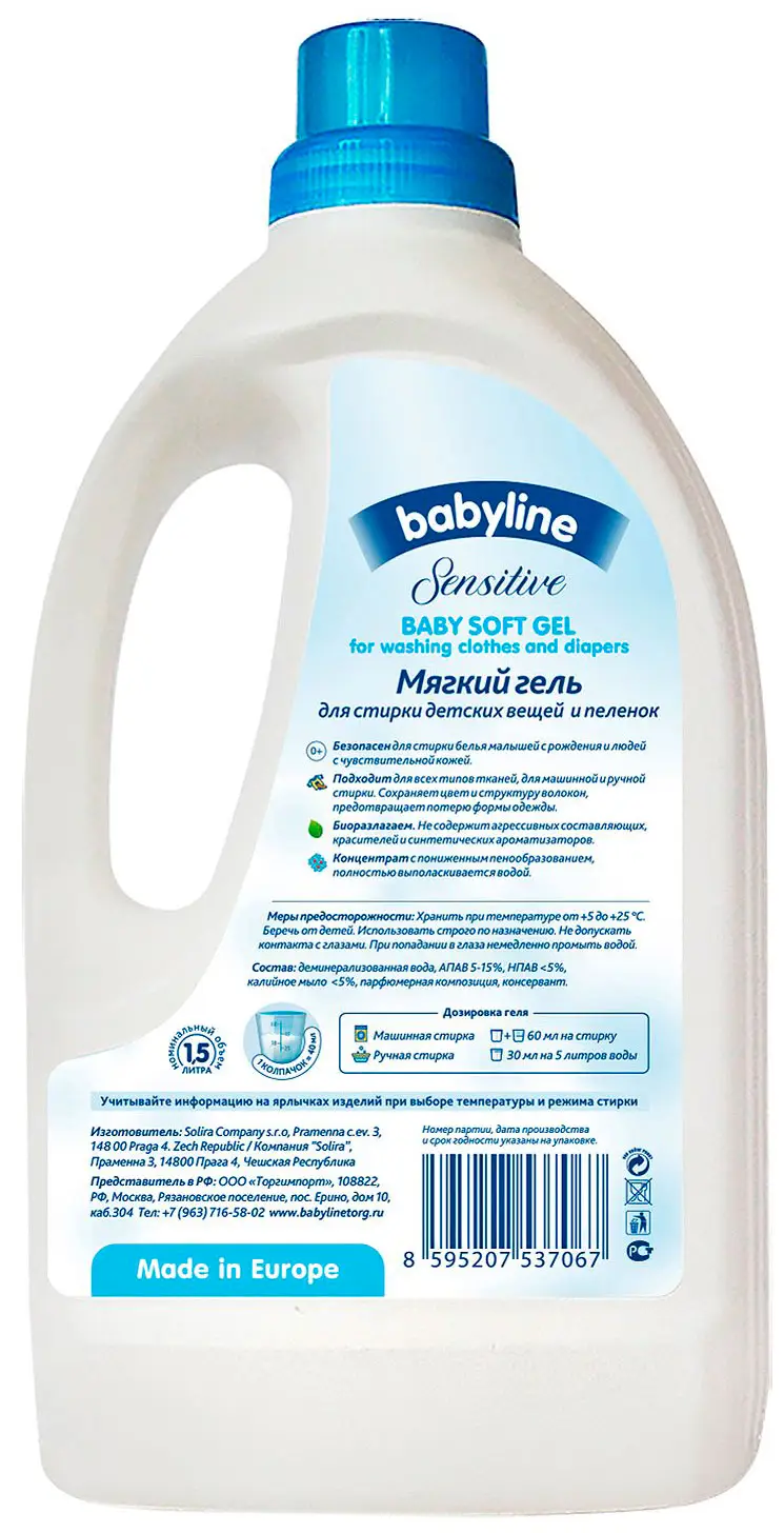 Мягкий гель для стирки детских вещей и пелёнок Babyline изготовлен из натуральных компонентов.