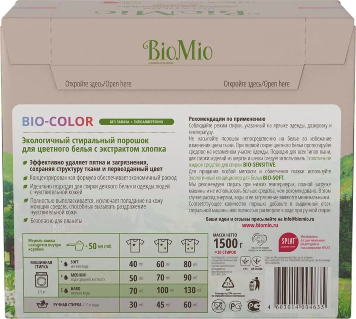 Экологичный стиральный био порошок для цветного белья био колор с экстрактом хлопка. Особенности: эффективно удаляет пятна и загрязнения, с...