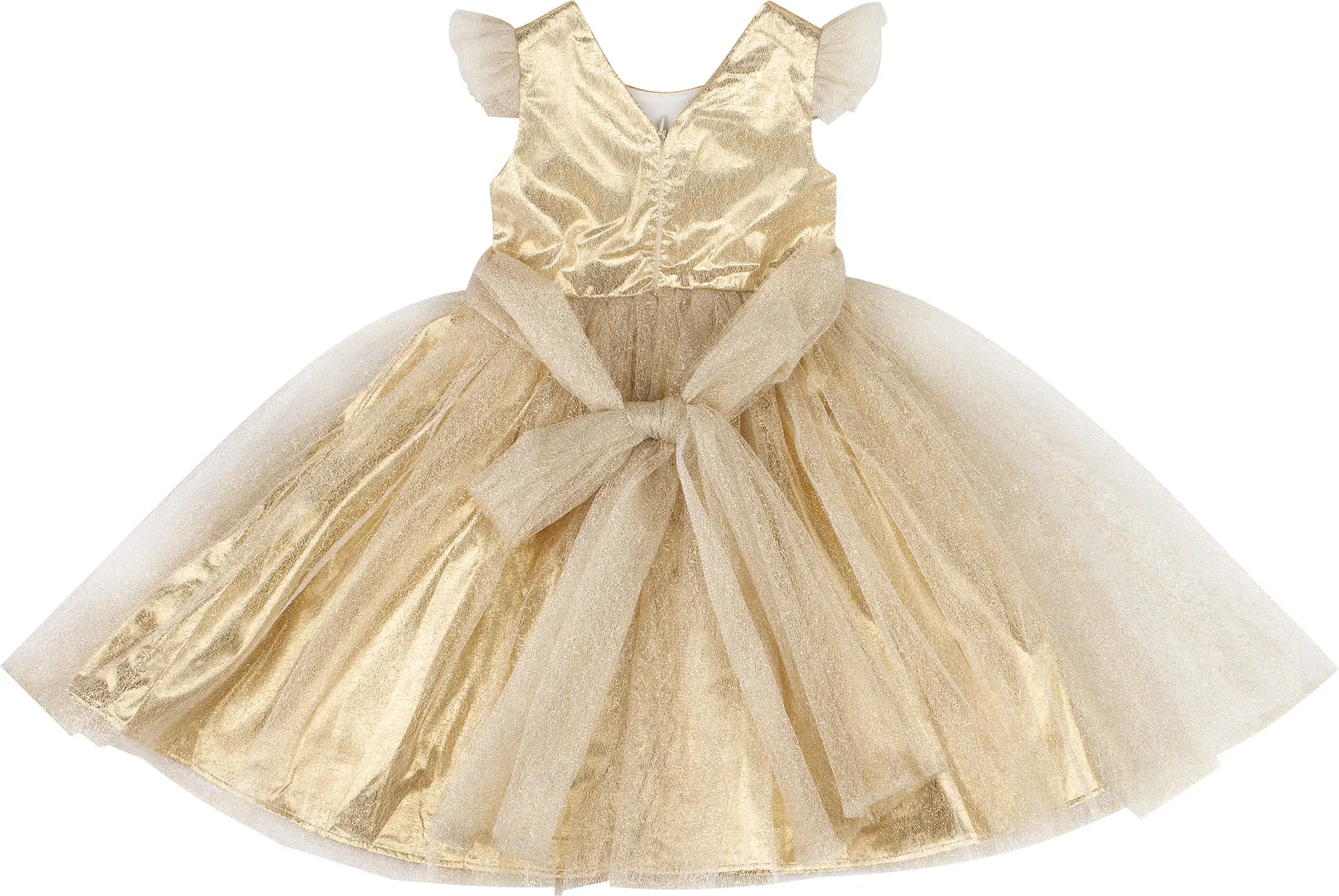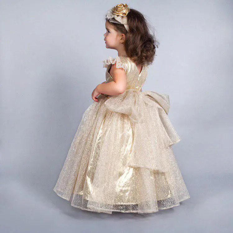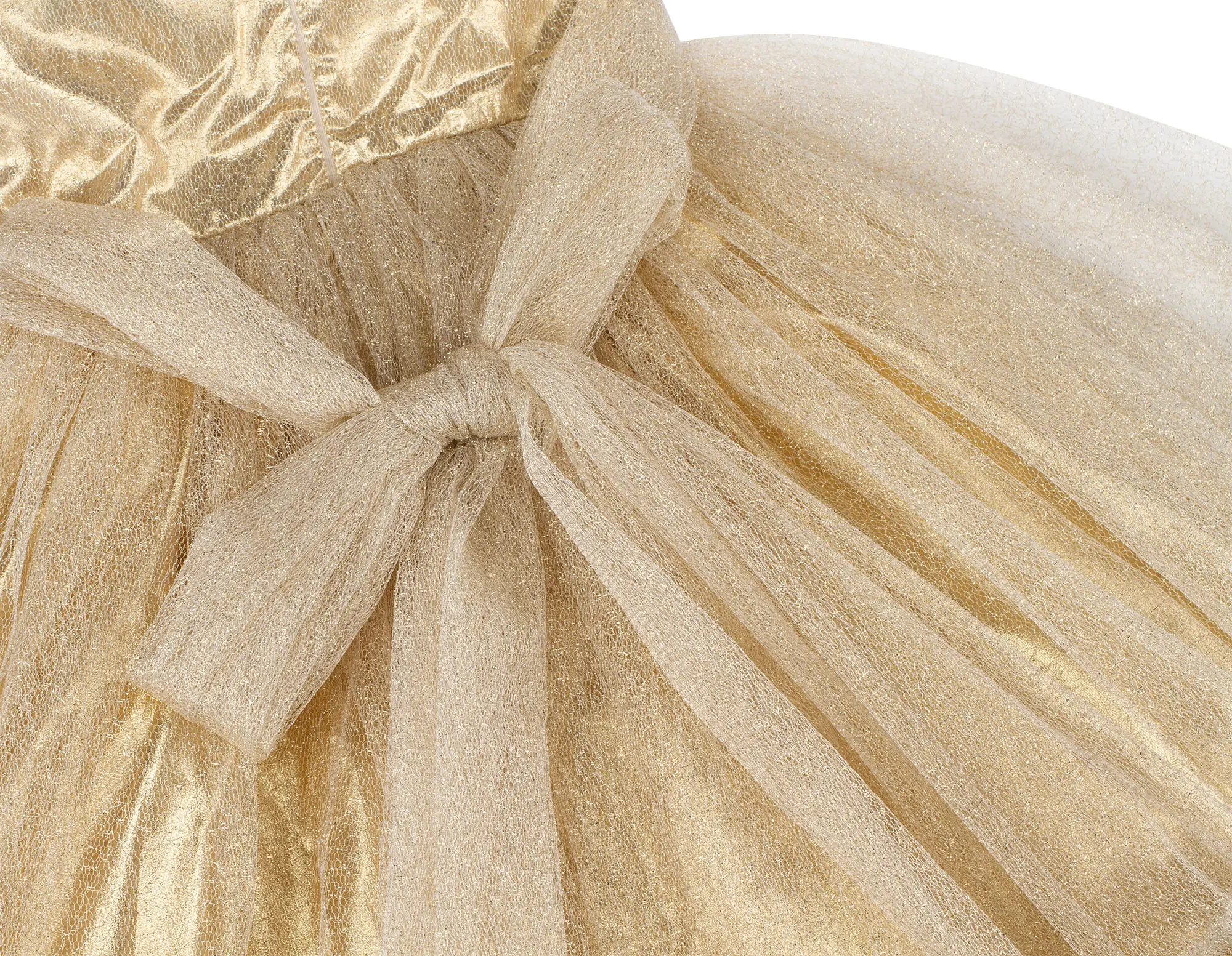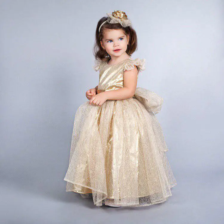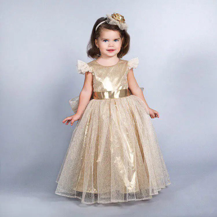 Платье с длинной юбкой Золотая Золушка – это то самое платье, о котором мечтают все маленькие принцессы. Волшебная расцветка, отрезная талия с атласным поясом и пышным бантом сзади.