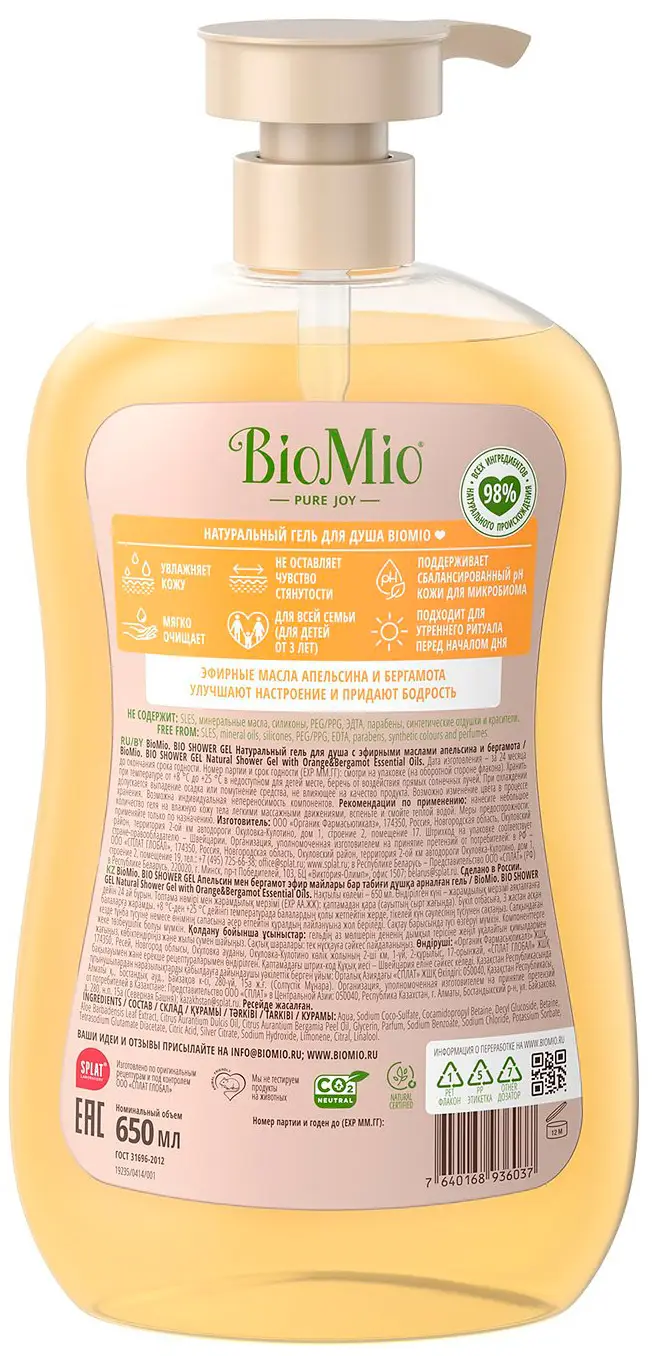 Натуральный гель для душа с эфирными маслами апельсина и бергамота BioMio 650 мл