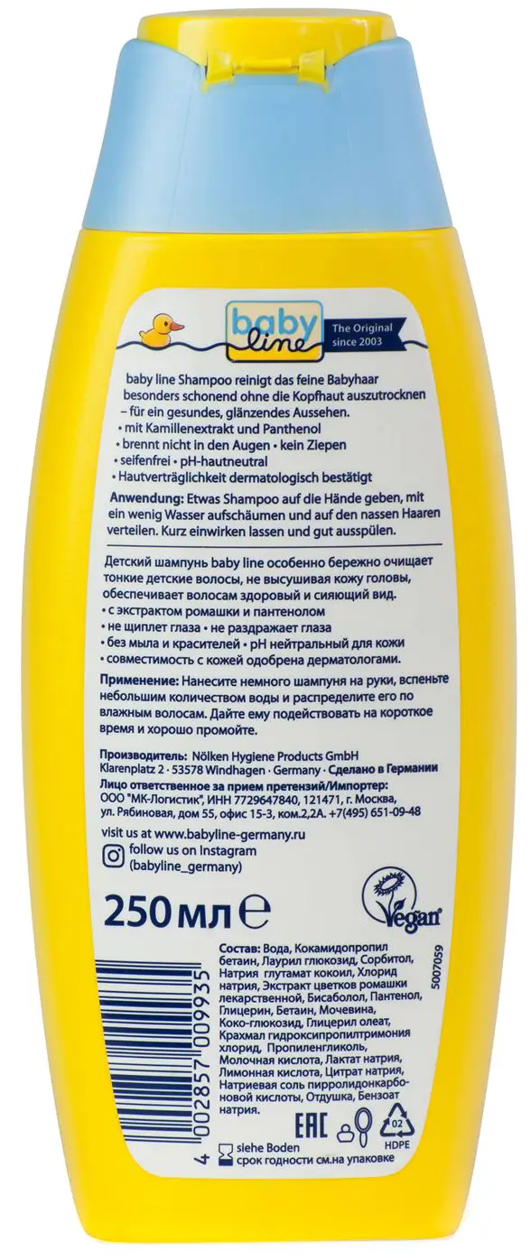 Детский шампунь Babyline особенно бережно очищает тонкие детские волосы, не высушивая кожу головы, обеспечивая волосам здоровый и сияющий вид. С экстрактом ромашки и пантенолом, не щиплет глазки, без мыла и красителей, рН нейтральный для кожи, совместимость с кожей одобрена дерматологами, веганский.