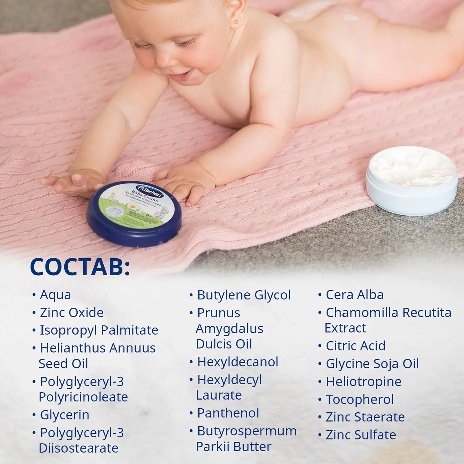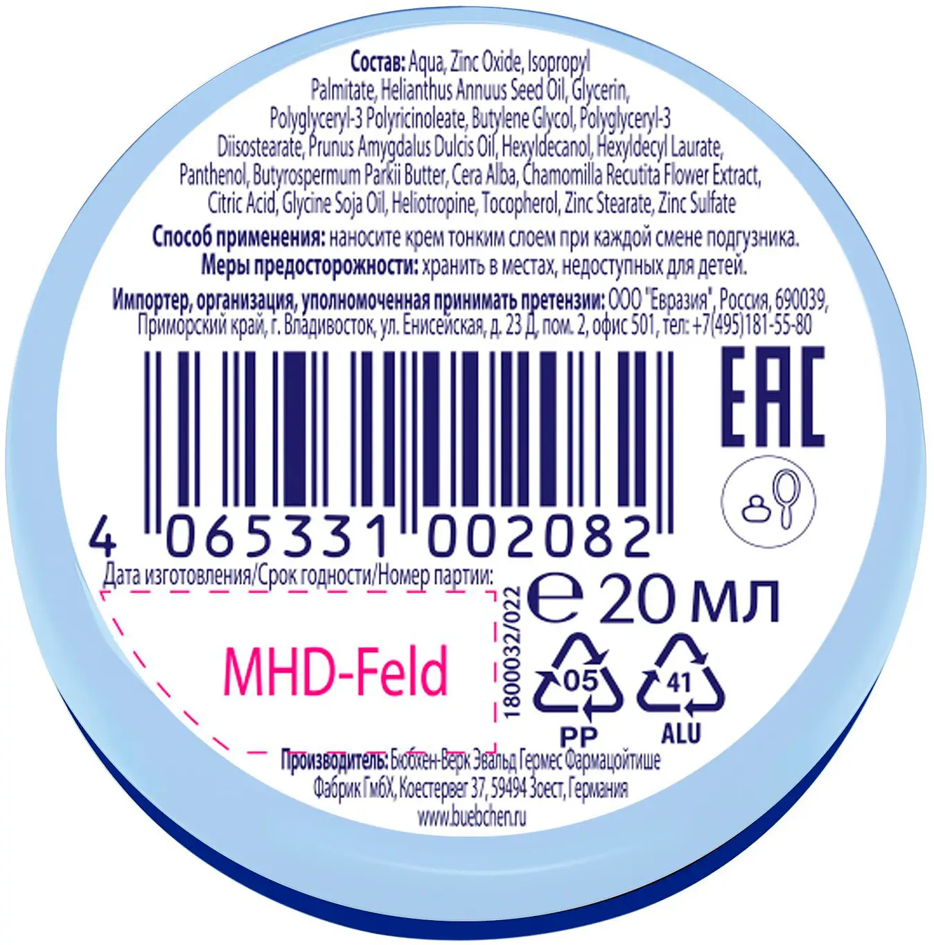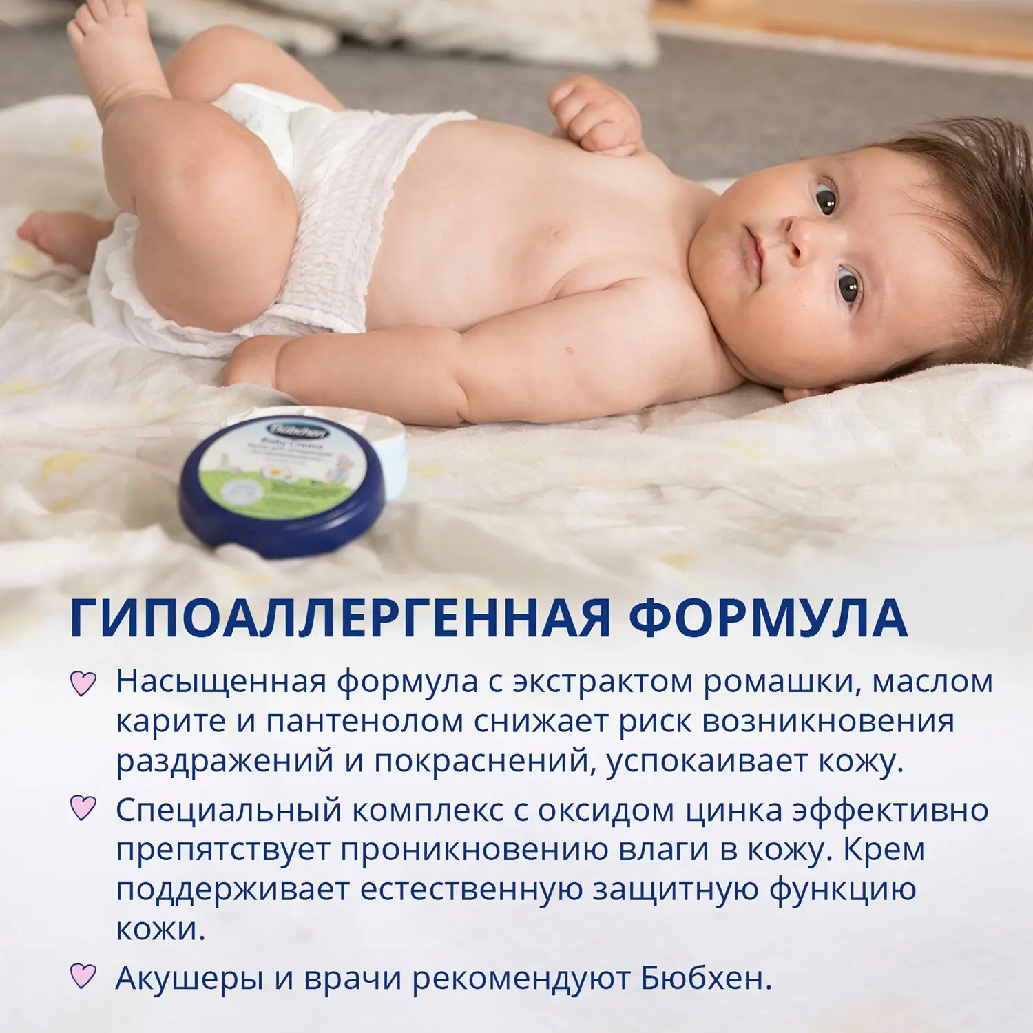 Богатая полезными веществами формула с оксидом цинка, ромашкой и пантенолом препятствует возникновению раздражений и покраснений на коже. Специальный комплекс с оксидом цинка эффективно защищает от влаги. Крем поддерживает естественную защитную функцию кожи. Он разработан с целью минимизировать риск возникновения аллергических реакций. Акушеры и врачи рекомендуют Бюбхен.