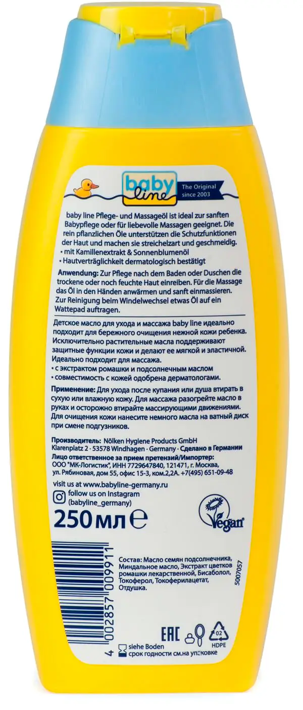 Детское масло для ухода и массажа Babyline идеально подходит для бережного очищения нежной кожи ребёнка.