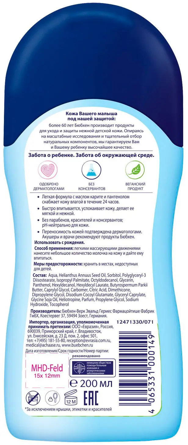 Молочко быстро впитывается, успокаивает кожу и делает ее мягкой и эластичной. Акушеры и врачи рекомендуют Бюбхен. Уникальный продукт для все...