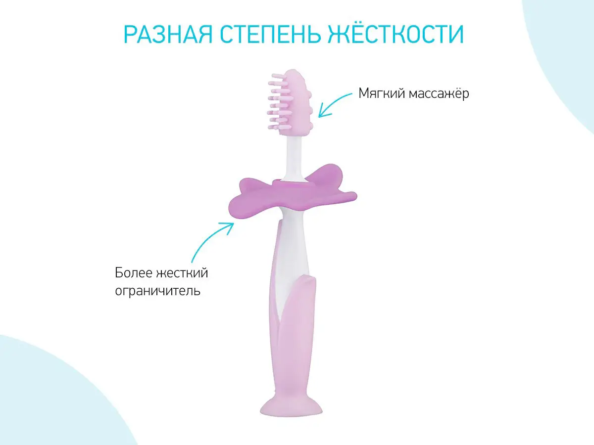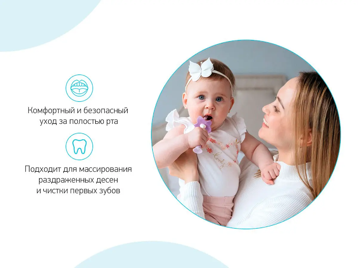 Подходит для массирования раздраженных дёсен и чистки первых зубов. Ограничитель защищает малыша от заглатывания, снимается при необходимос...