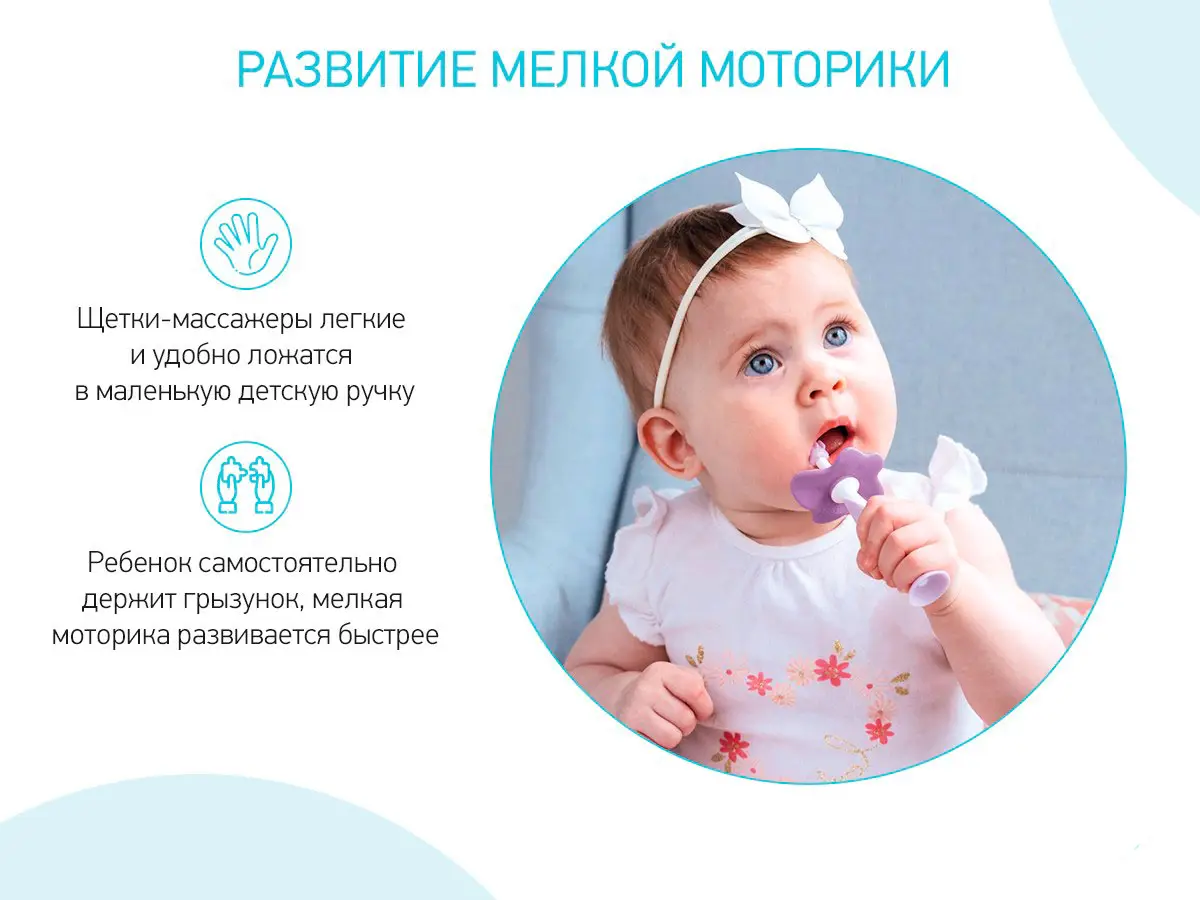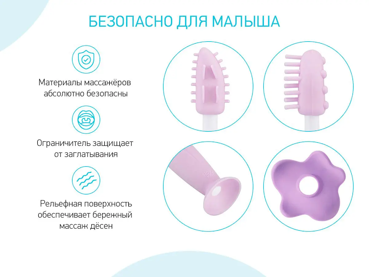 Подходит для массирования раздраженных дёсен и чистки первых зубов. Ограничитель защищает малыша от заглатывания, снимается при необходимости. Прорезыватели просты в уходе, не скапливают на себе пыль, достаточно промыть теплой водой. Набор сертифицирован, материал гипоаллергенен и безопасен для детей.