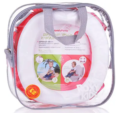 дорожный горшок – в путешествии он используется со специальными одноразовыми пакетами, которые устанавливаются на место вкладки, а после использования просто утилизируются, как подгузники. Пакеты кладутся под сиденье, так что ребенок не испытывает никаких дискомфортных ощущений. Для удобства переноски ножки горшка складываются внутрь, так что приспособление занимает минимум места. Отличный горшок в дорогу.