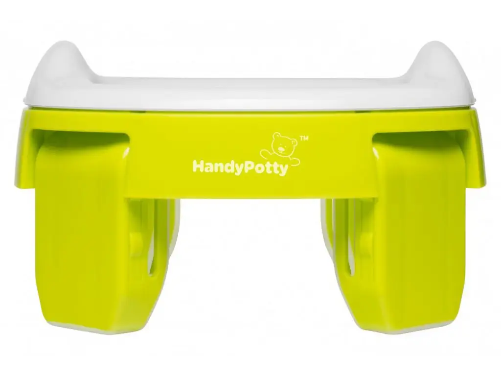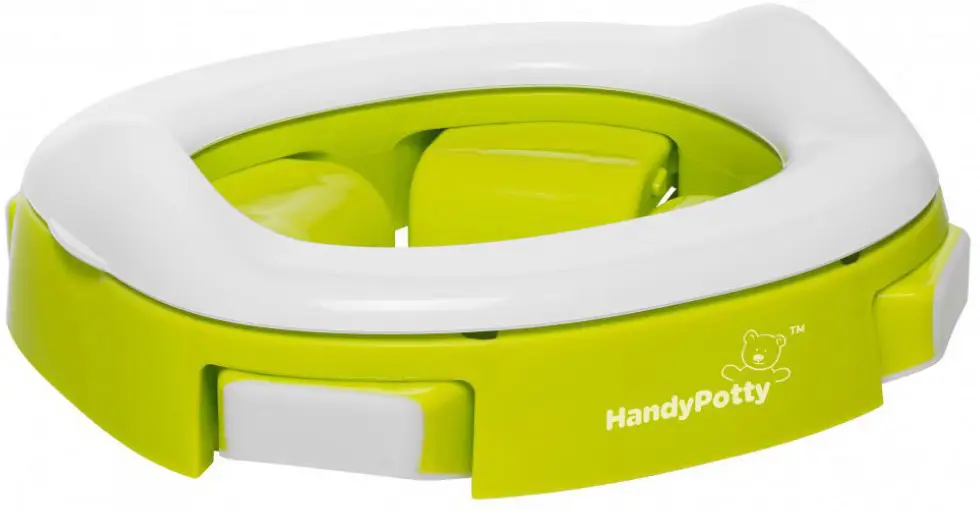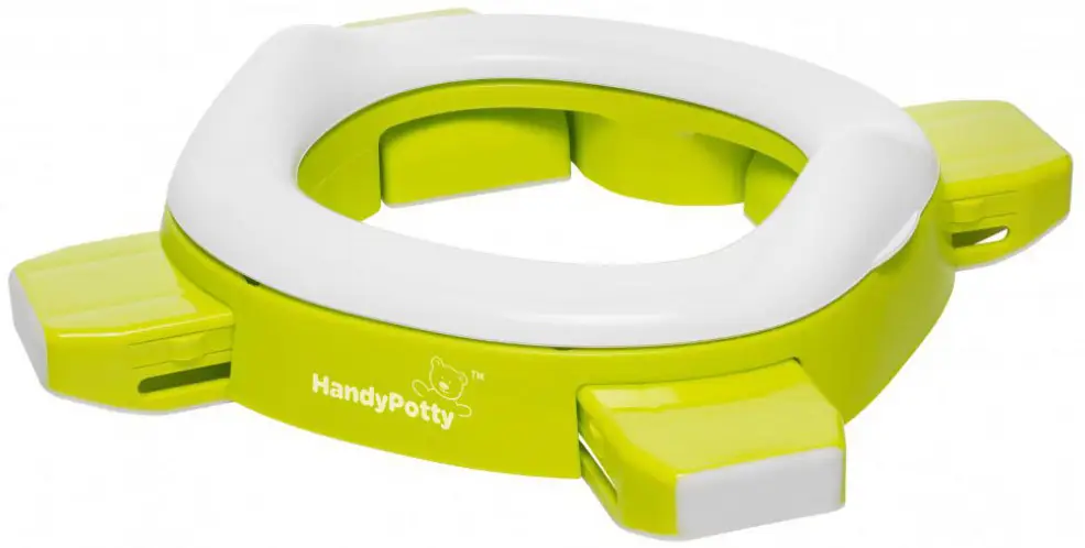 адаптер на унитаз – вы можете использовать HandyPotty в качестве детского сиденья на унитаз, просто развернув ножки в стороны до упора. Это позволяет ребёнку безопасно сидеть на унитазе, адаптер предотвращает контакт с бактериями, обитающими на крышке.