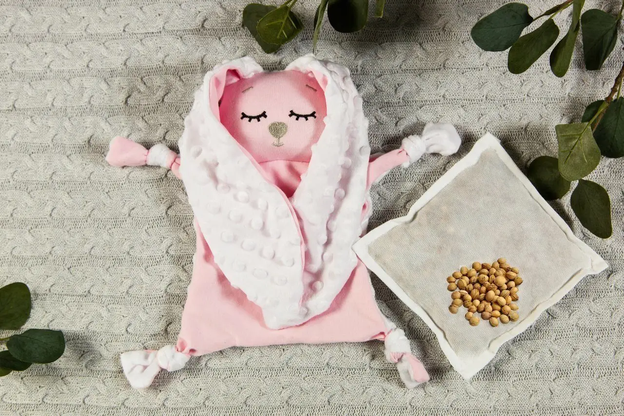 состоит из милой игрушки комфортера и грелки из вишнёвых косточек в индивидуальном чехле;