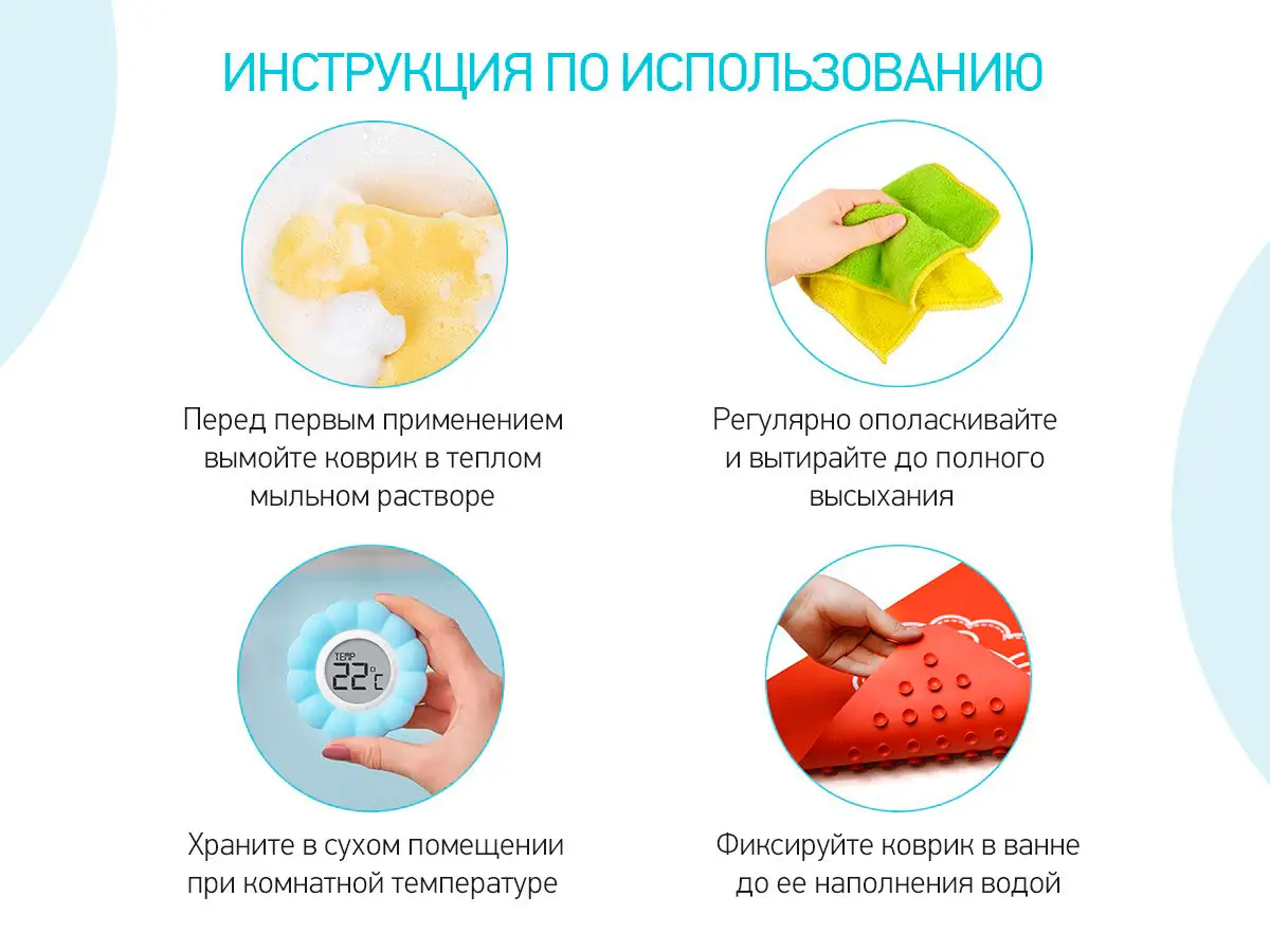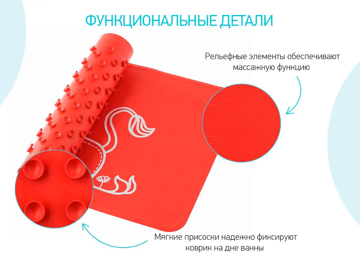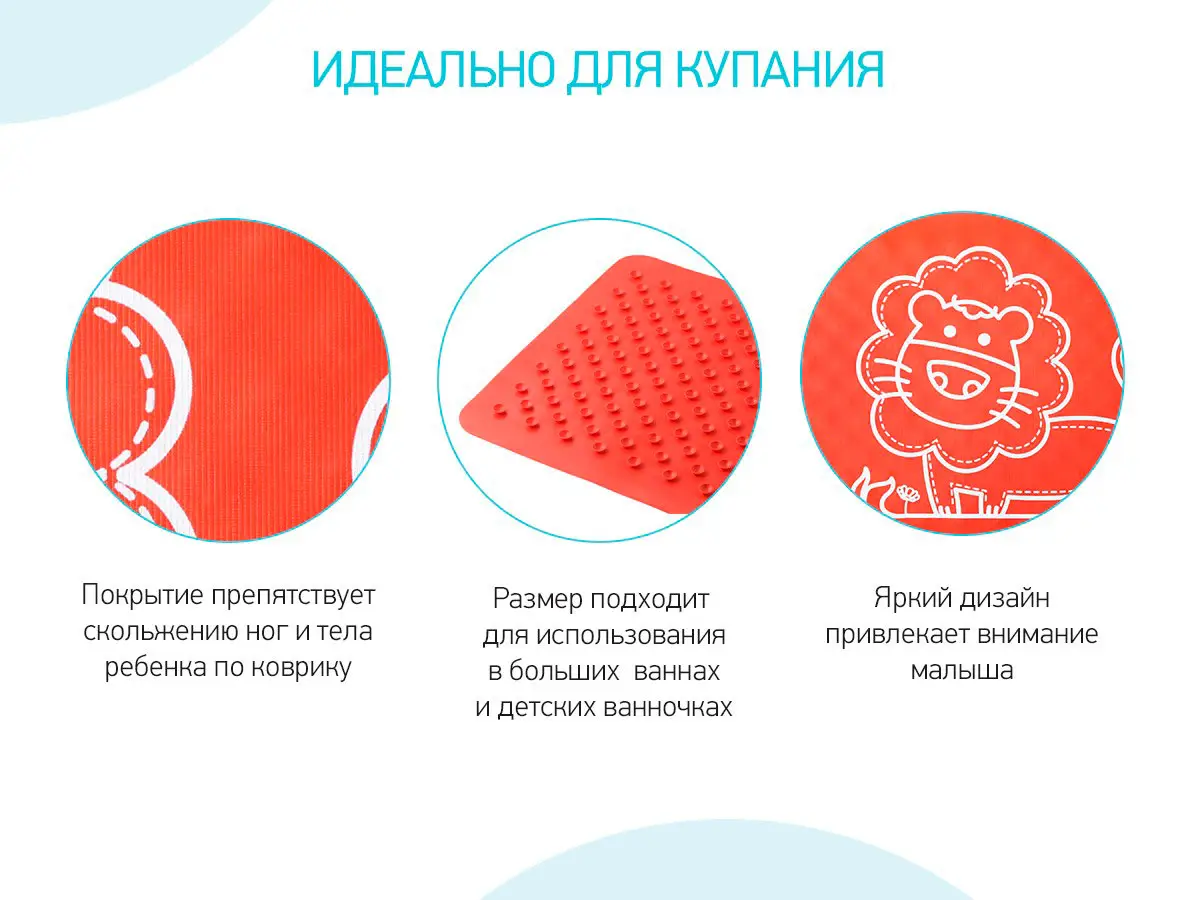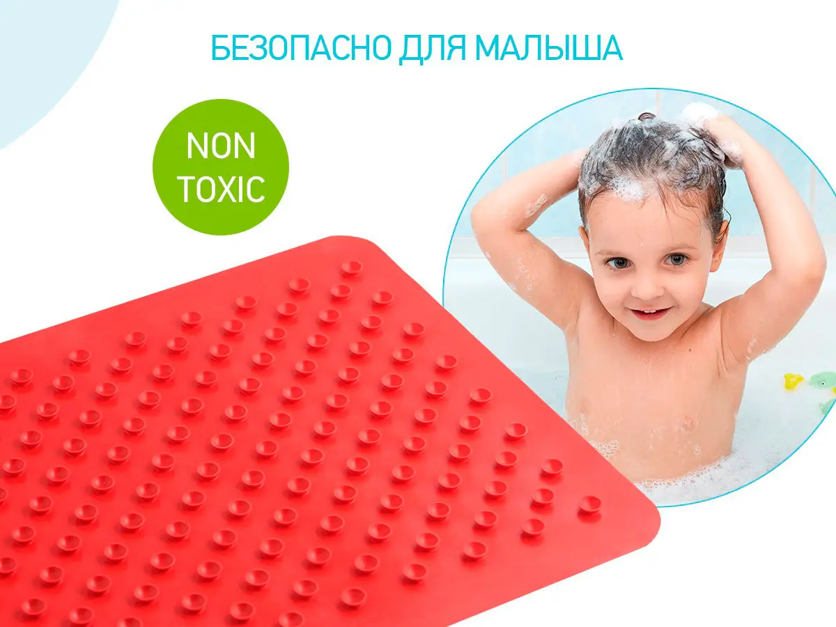 Оптимальный размер коврика делает его доступным для использования как в больших ваннах, так и в детских ванночках. Коврик, изготовленный из натуральной резины без применения токсичного сырья, полностью соответствует требованиям безопасности детской продукции.