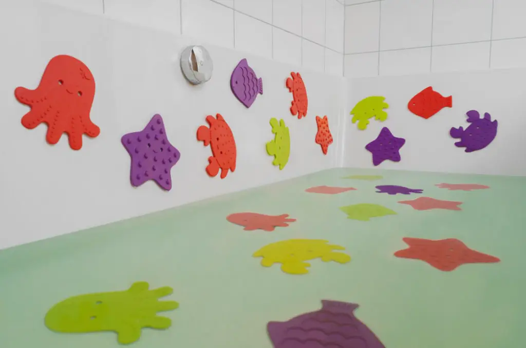 Это тренажёр для развития мелкой моторики и хватательных рефлексов, который также познакомит малыша с названиями морских обитателей и поможет выучить основные цвета. Помимо того, коврики станут украшением интерьера. C их помощью вы расставите яркие цветовые акценты на дно и стенки ванны, на кафель и пол.