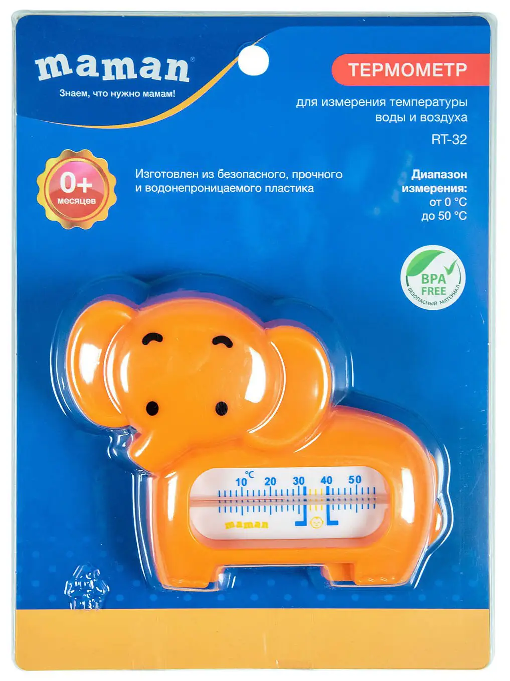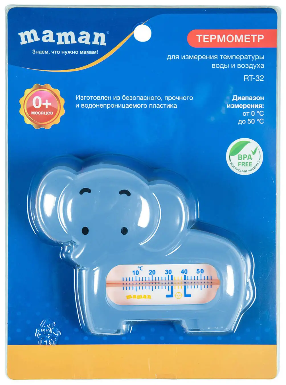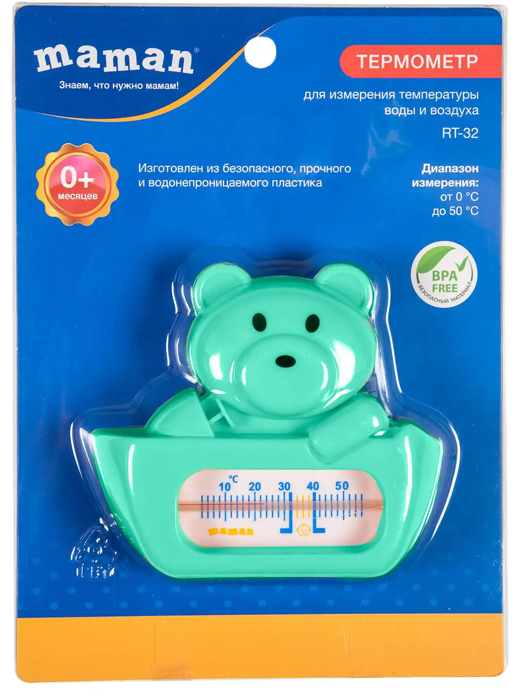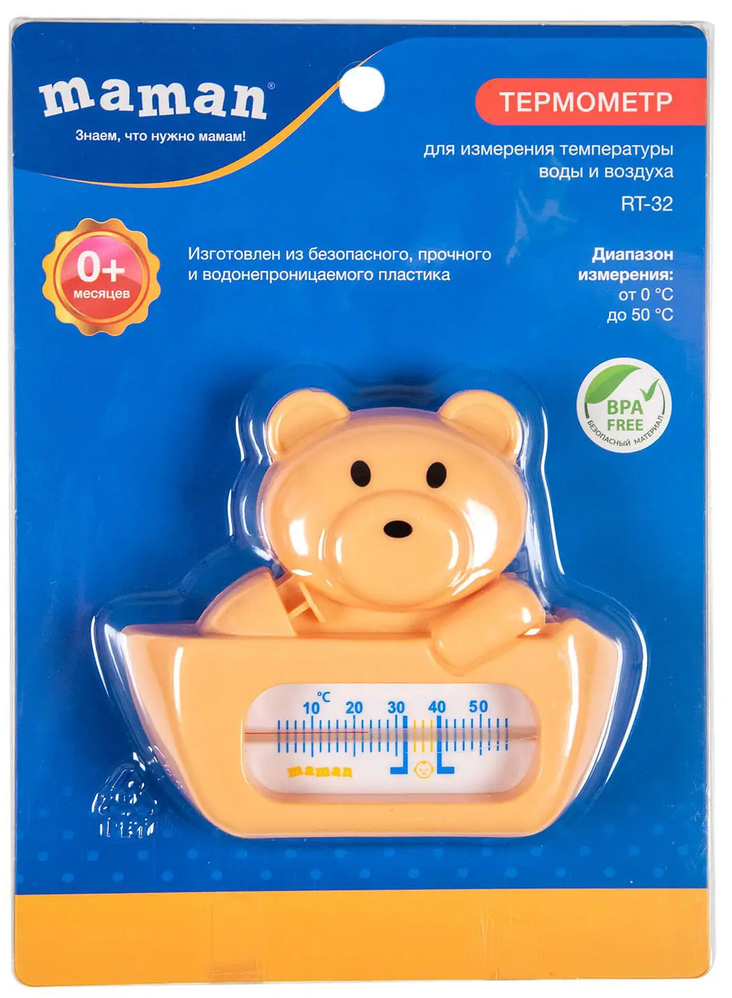 Термометр Maman RT-32 предназначен для измерения и контроля температуры воды в ванной при купании ребёнка, позволяет определять температуру воздуха в помещении.