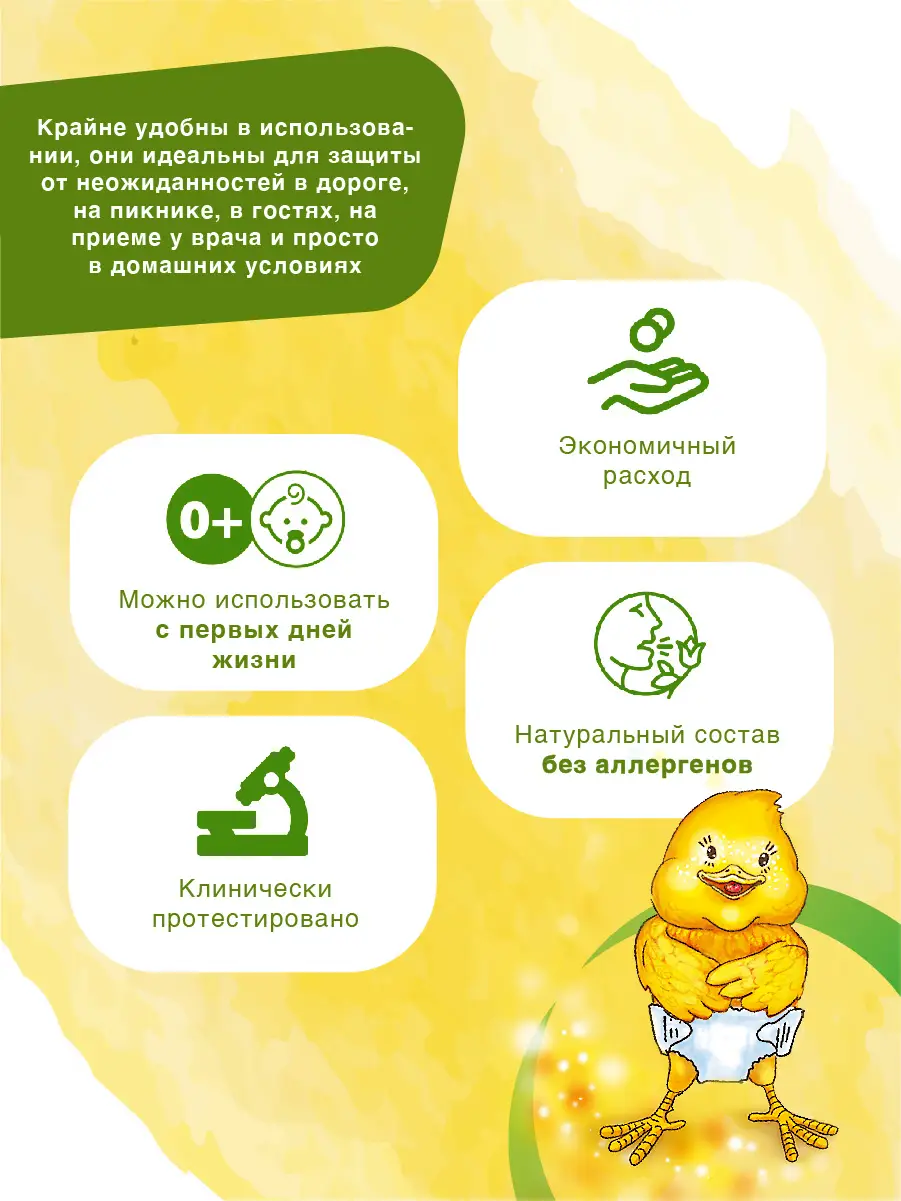 Детские гигиенические одноразовые пелёнки незаменимы с первого дня жизни. Предназначены для защиты и ухода за вашими детьми. Крайне удобны в использовании, они идеальны для защиты от неожиданностей в дороге, на пикнике, в гостях, на приеме у врача и просто в домашних условиях. Содержат пять уникальных слоев. Первый слой сделан из уникальный мягких нетканых материалов, которые не раздражают нежную кожу вашего ребенка и создают ему уютную атмосферу комфорта. Второй дышащий бумажный слой позволяет влаге быстро впитаться, оставляя поверхность идеально сухой. Третий слой состоит из распущенной целлюлозы с уникальным абсорбентом, который быстро впитывает влагу, преобразует жидкость в гель и препятствует распространению запаха. Четвертый – дополнительный дышащий бумажный слой. Пятый слой – надёжный не скользящий нижний полиэтилен, окончательно исключающий любую возможность проникновения влаги на поверхность.