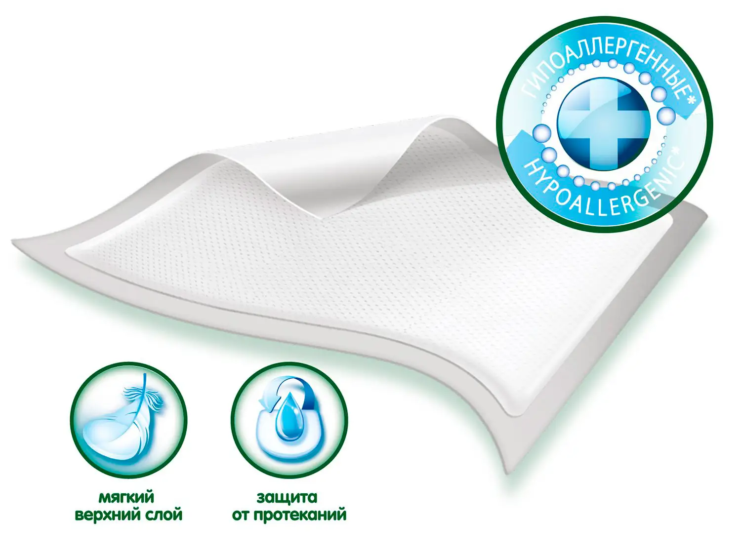Мягкие пеленки отлично защищают различные поверхности от намокания. Впитывающий слой хорошо удерживают влагу, а верхний слой изготовлен из специального гипоаллергенного нетканого материала.