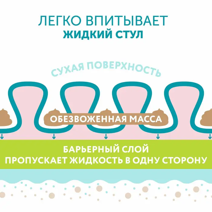- подгузник за секунды впитывает, равномерно распределяет и надежно удерживает детские испражнения;