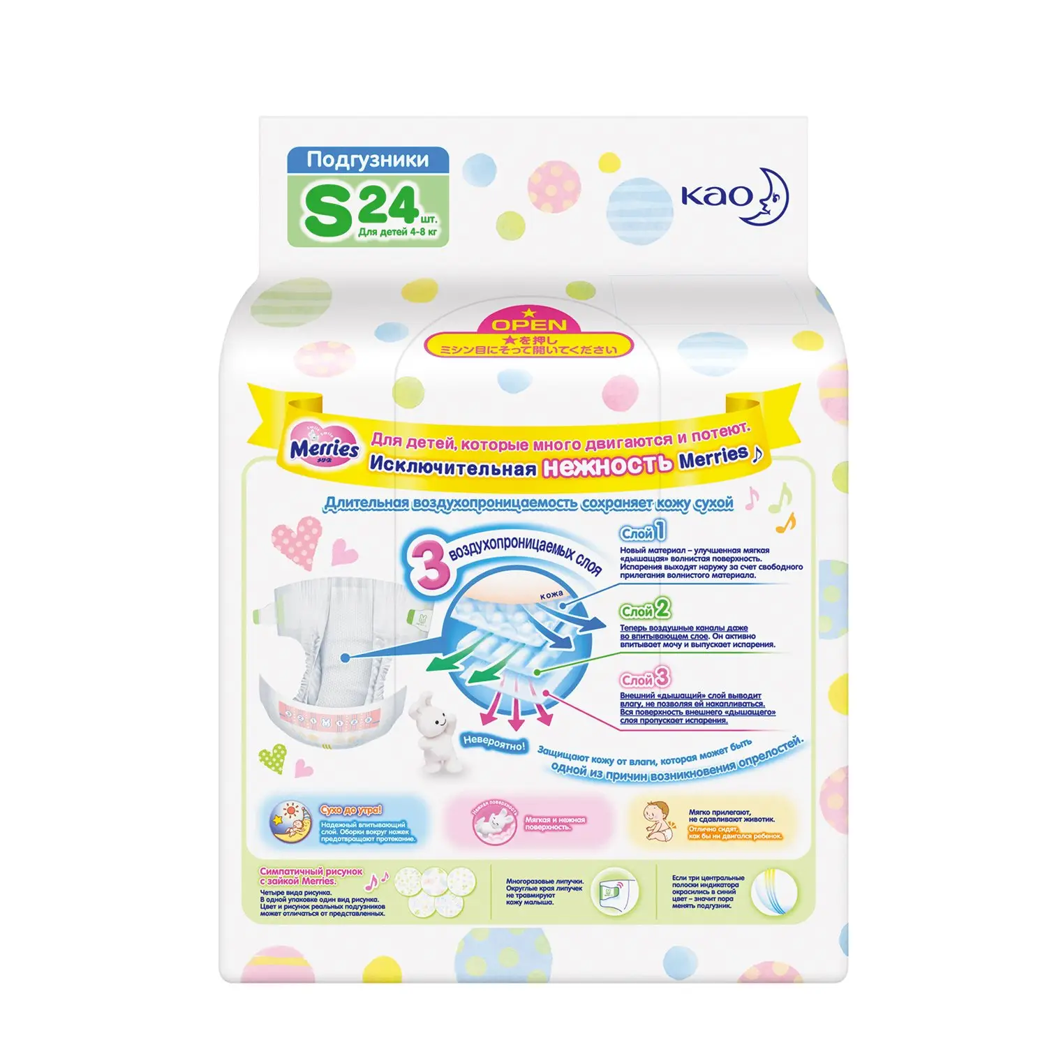 Мягкие подгузники Merries S предназначены для девочек и мальчиков весом от 4 до 8 кг. Благодаря многослойной структуре они дарят нежной и чу...