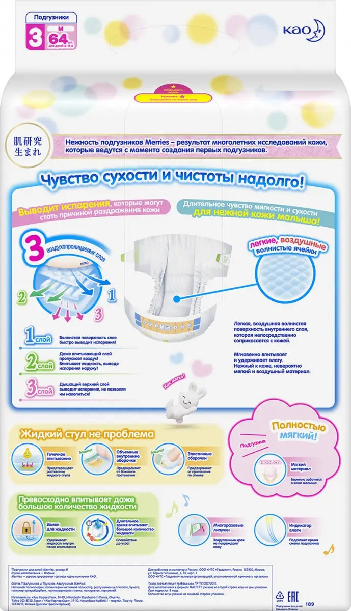 Инновационная технология 3 «дышащих» слоёв отлично выводит прелый воздух из подгузника за счёт свободного прилегания волнистого материала, ч...