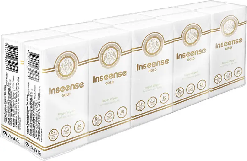 Бумажные носовые платочки Inseense произведены с добавлением натуральных волокон хлопка и обеспечивают очищение кожи без раздражений.