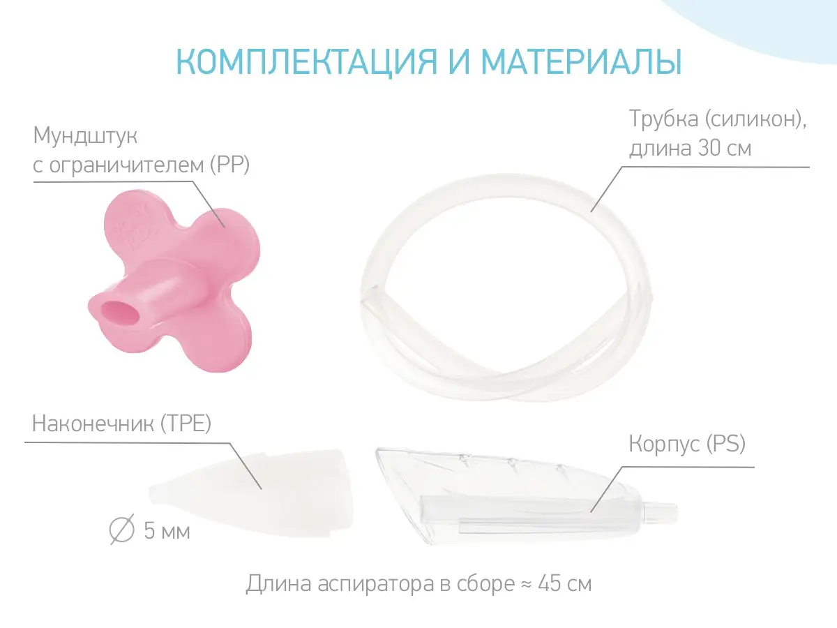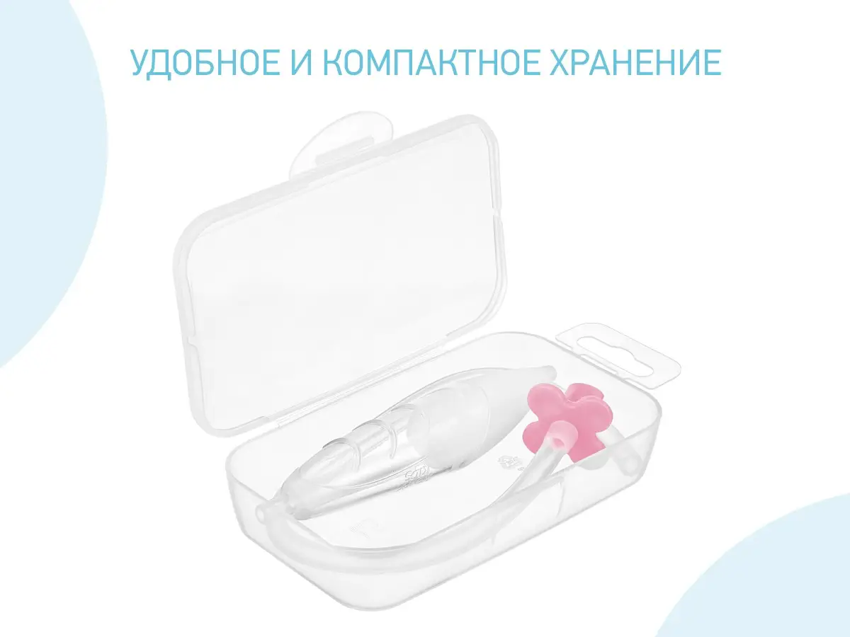 - яркий ограничитель в виде цветочка привлекает внимание ребёнка и позволяет маме удобно держать мундштук аспиратора во рту;