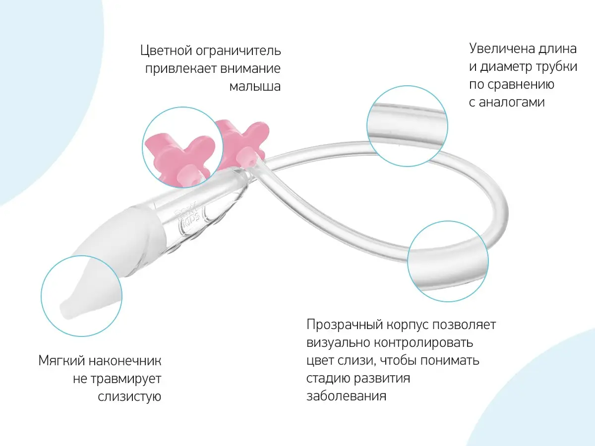 Назальный аспиратор для удаления слизи из носа с мягким наконечником является уникальной разработкой ROXY-KIDS с запатентованной конструкцией. Этот прибор легко и быстро поможет избавить носик новорожденного, грудного ребенка и детей младшего дошкольного возраста (до 3 лет) от заложенности.