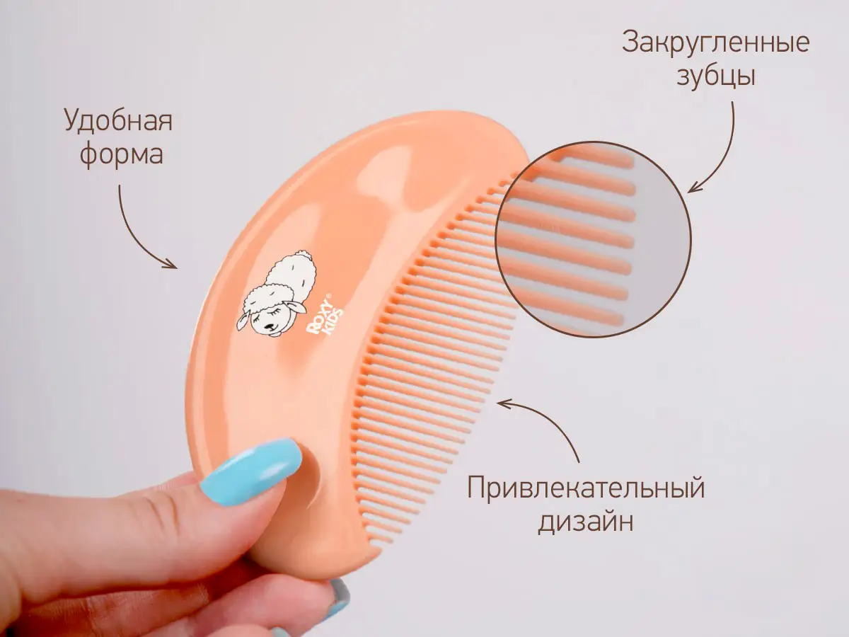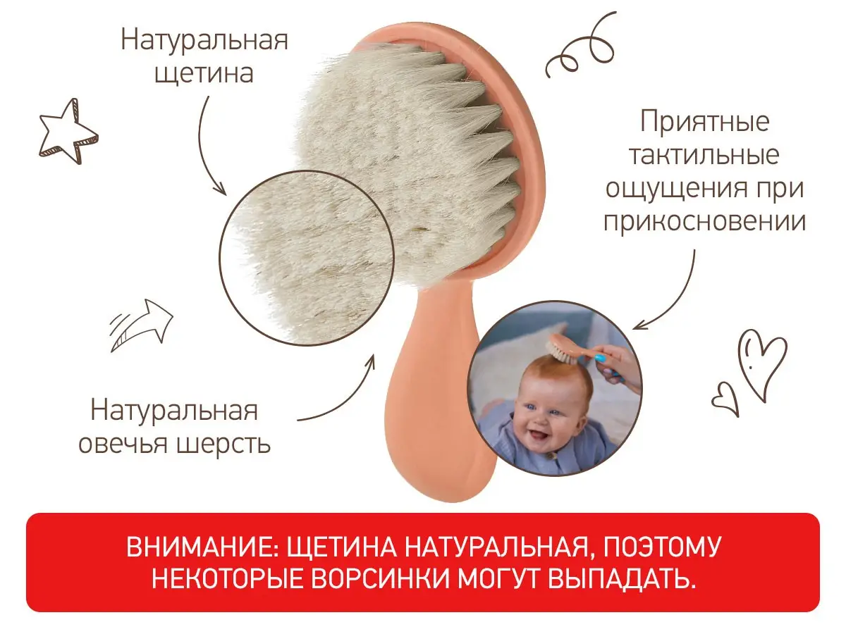 Мягкая пушистая щётка имеет удобную эргономичную ручку, улучшает кровообращение кожи головы, не царапая её. Нежный массаж расслабляет и успокаивает перед сном, а стимуляция волосяных луковиц ускоряет рост первых волос малыша. Натуральная щётка из овчины позволит пригладить волосики и придать им аккуратный вид. А с помощью гребешка с частыми закругленными зубчиками удобно расчёсывать запутавшиеся и скатавшиеся волосы.