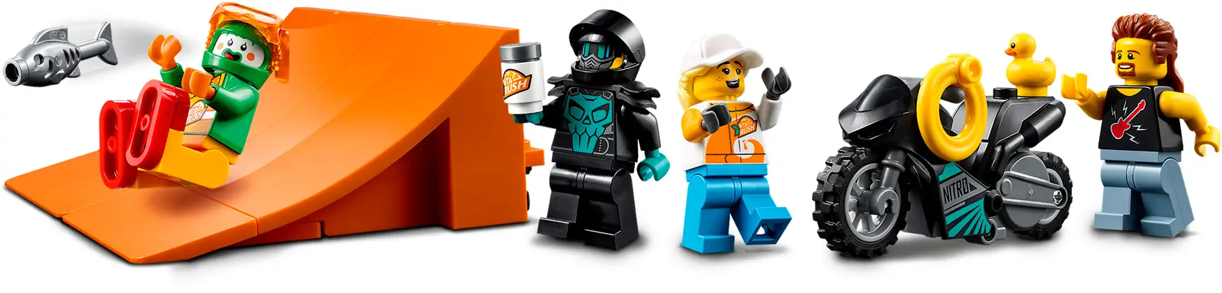 Присоединяйтесь к персонажам сериала «Лего Сити» клоуну Цитрусу, Нейту и Инкогнитро для захватывающих трюков! Разгоняйте мотоцикл с маховиком и прыгайте с трамплина, чтобы попасть в яблочко мишени и сбросить клоуна Цитруса в бак. Выполняйте потрясающие прыжки и приземления. Сможете миновать грузовик? Скоро вы это выясните! В этом потрясающем наборе с грузовиком для шоу каскадёров есть всё необходимое снаряжение, чтобы устраивать потрясающие трюки.