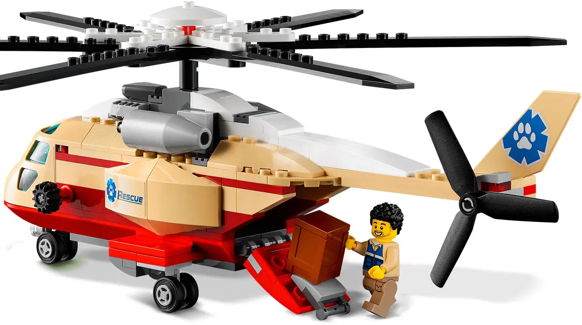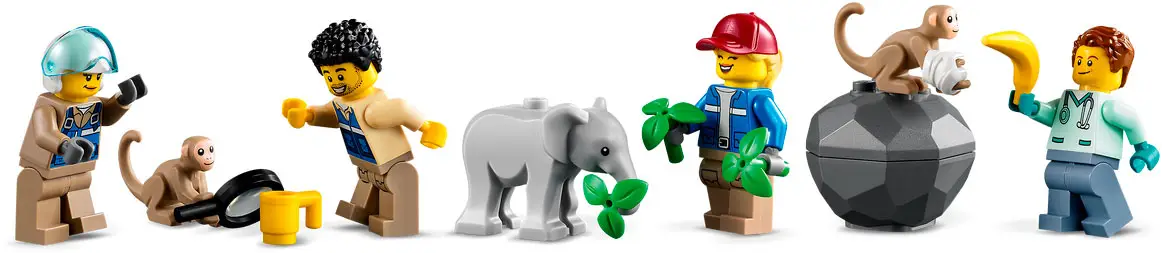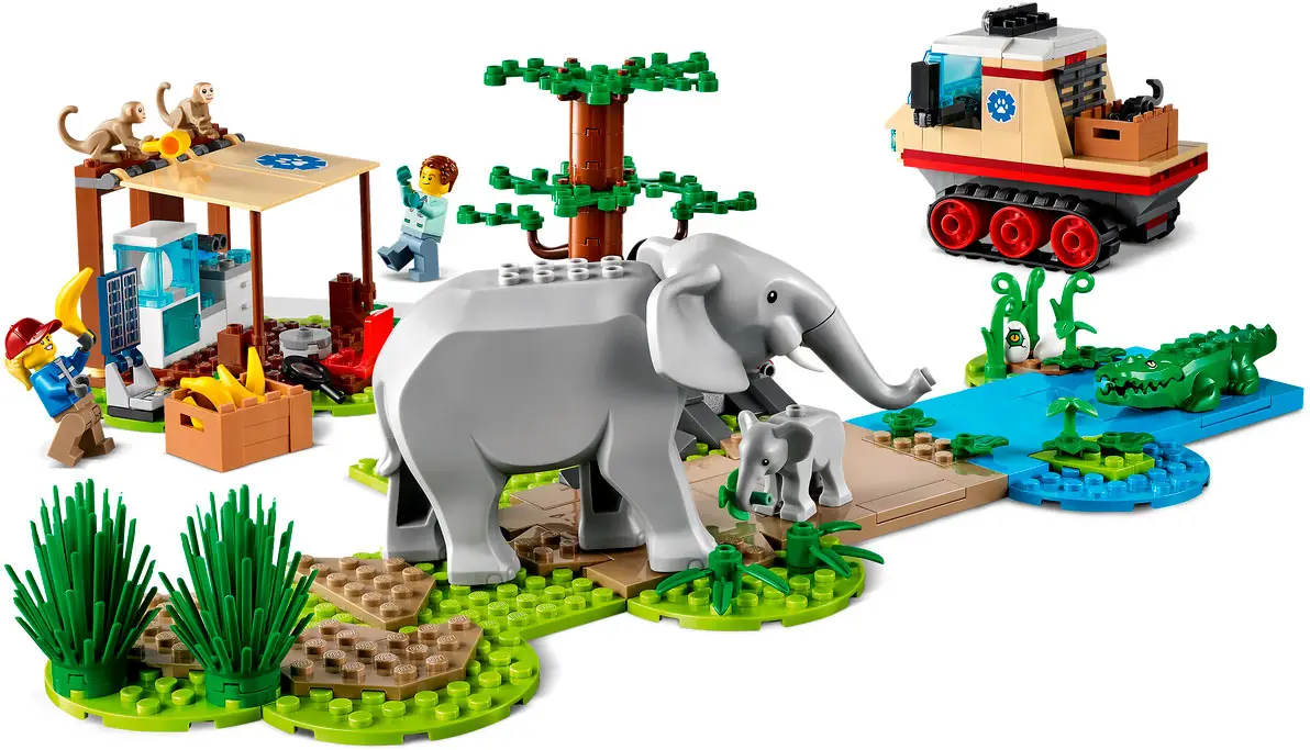 - включает всё, что нужно детям, чтобы сделать игрушечный вертолёт с лебедкой, гусеничную машину, ветеринарную станцию, саванный ландшафт с функцией оползня, плюс фигурки слона, слоненка, крокодила и двух обезьян и 4 минифигурки;