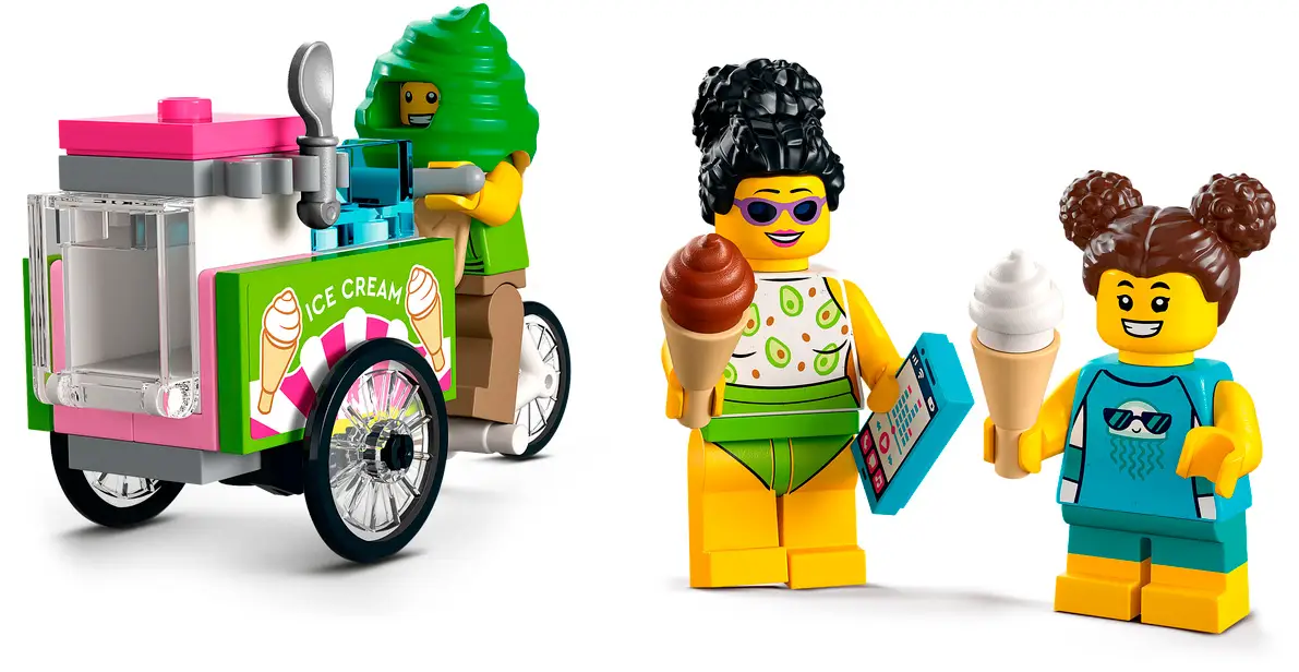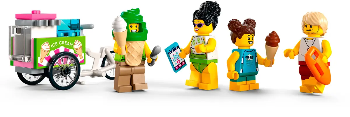 - в коробке все необходимое для сборки двухэтажной спасательной станции, квадроцикла, тележки с мороженым и пляжной зоны с пальмой, а также четыре минифигурки и фигурки краба и черепахи;